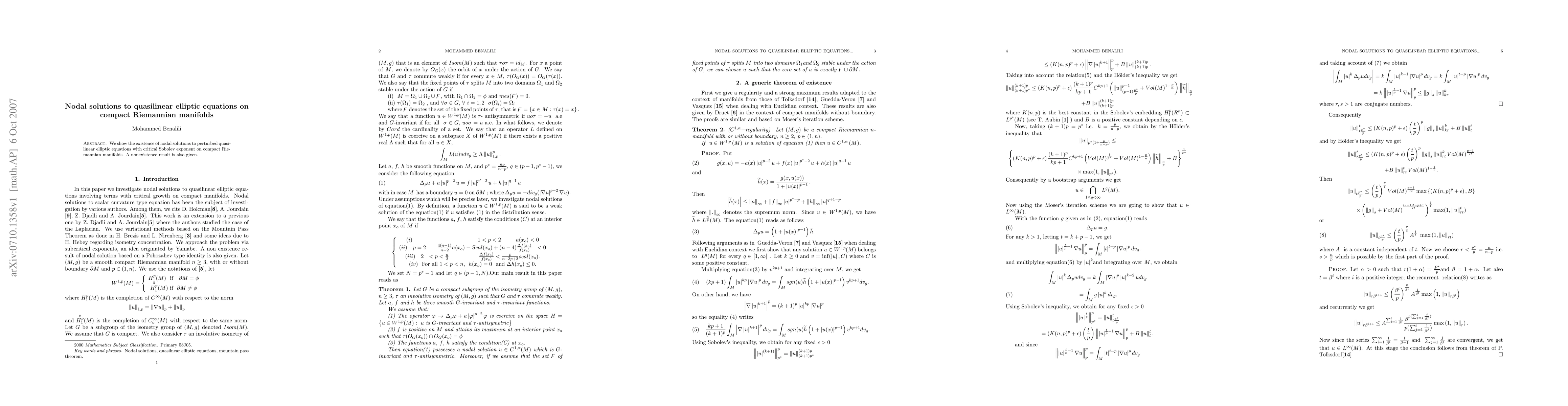 Summary: This paper demonstrates the existence of nodal solutions for perturbed quasilinear elliptic equations on compact Riemannian manifolds at critical Sobolev exponents, while also presenting a nonexistence result.