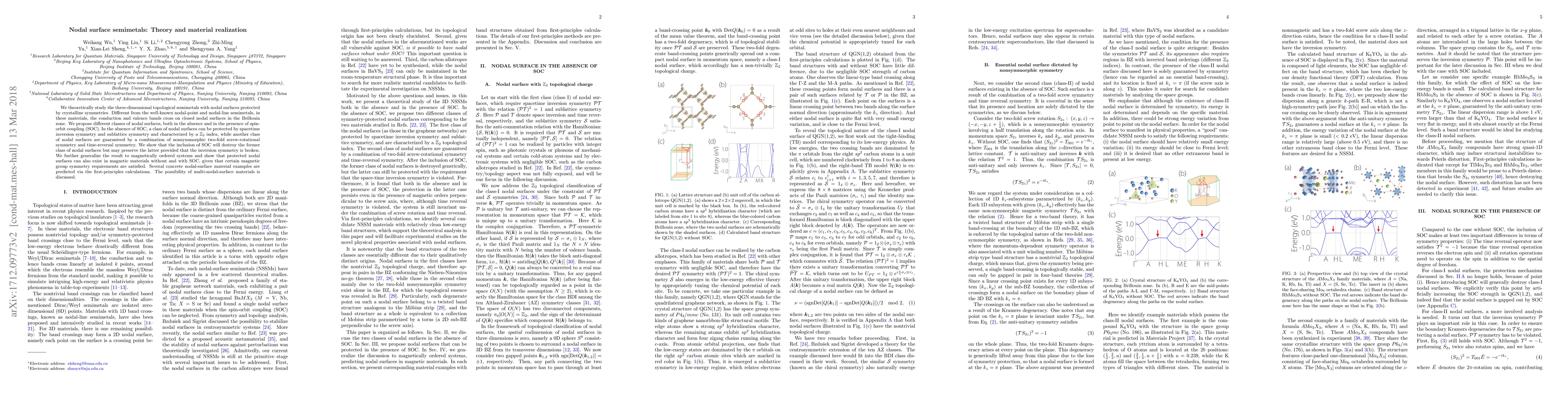 We theoretically study the three-dimensional topological semimetals with nodal surfaces protected by crystalline symmetries. Different from the well-known nodal-point and nodal-line semimetals, in these materials, the conduction and valence bands cross on closed nodal surfaces in the Brillouin zone. We propose different classes of nodal surfaces, both in the absence and in the presence of spin-orbit coupling (SOC). In the absence of SOC, a class of nodal surfaces can be protected by spacetime inversion symmetry and sublattice symmetry and characterized by a $\mathbb{Z}_2$ index, while another class of nodal surfaces are guaranteed by a combination of nonsymmorphic two-fold screw-rotational symmetry and time-reversal symmetry. We show that the inclusion of SOC will destroy the former class of nodal surfaces but may preserve the latter provided that the inversion symmetry is broken. We further generalize the result to magnetically ordered systems and show that protected nodal surfaces can also exist in magnetic materials without and with SOC, given that certain magnetic group symmetry requirements are satisfied. Several concrete nodal-surface material examples are predicted via the first-principles calculations. The possibility of multi-nodal-surface materials is discussed.