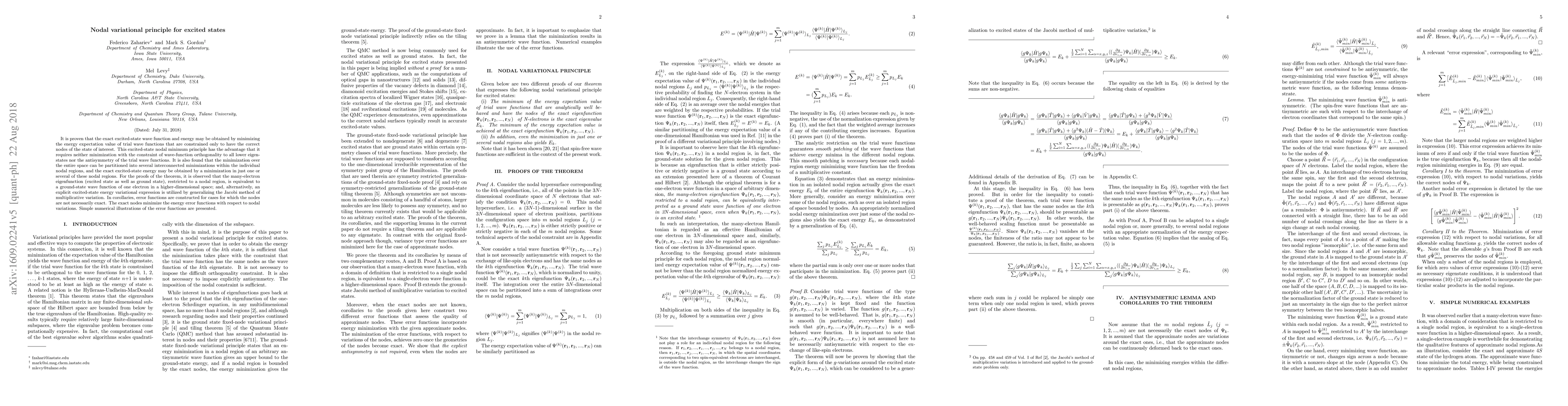 The paper establishes a nodal variational principle for obtaining exact excited-state wave functions and energies by minimizing energy within regions defined by the correct nodes, without requiring orthogonality or antisymmetry constraints. Numerical examples demonstrate the effectiveness of this approach.