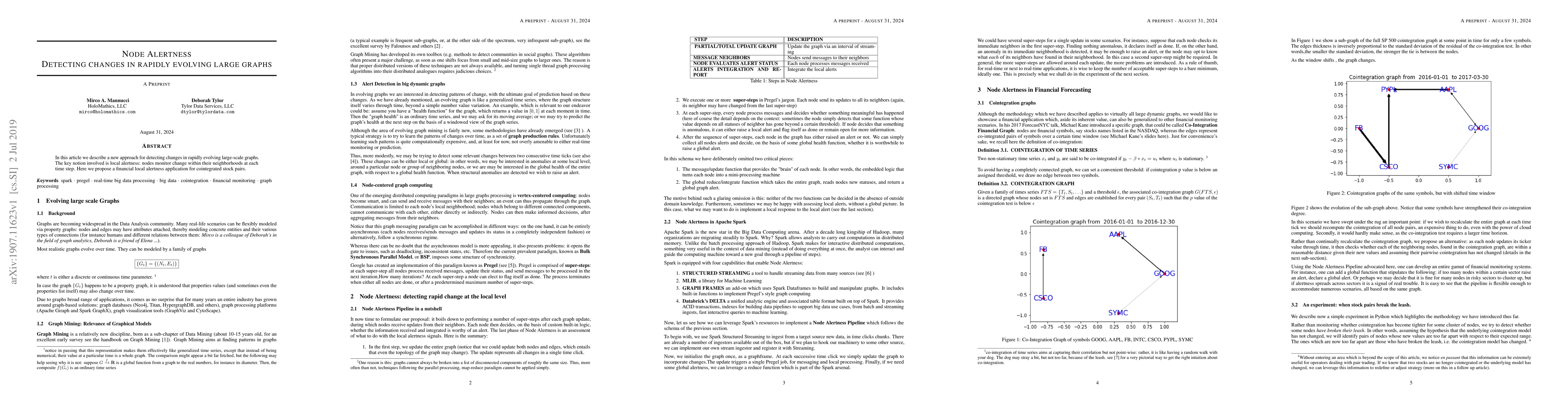 Summary: This paper introduces a novel method for detecting changes in large-scale, rapidly evolving graphs through local alertness, where nodes monitor changes within their neighborhoods. The approach is demonstrated with a financial application for identifying changes in cointegrated stock pairs.