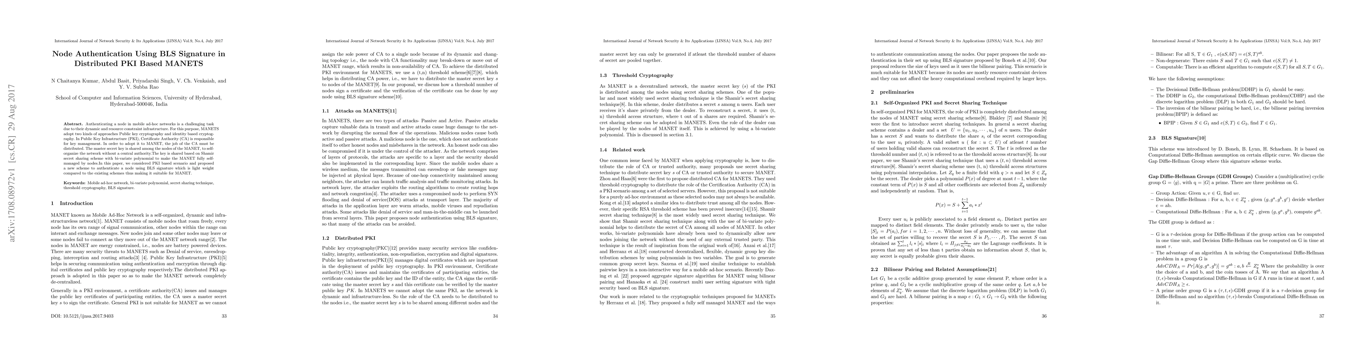 This paper proposes a lightweight node authentication scheme for mobile ad-hoc networks (MANETS) using BLS signatures within a distributed Public Key Infrastructure (PKI). The scheme leverages Shamir secret sharing to distribute the master secret key among nodes, enabling self-organization without a central authority.