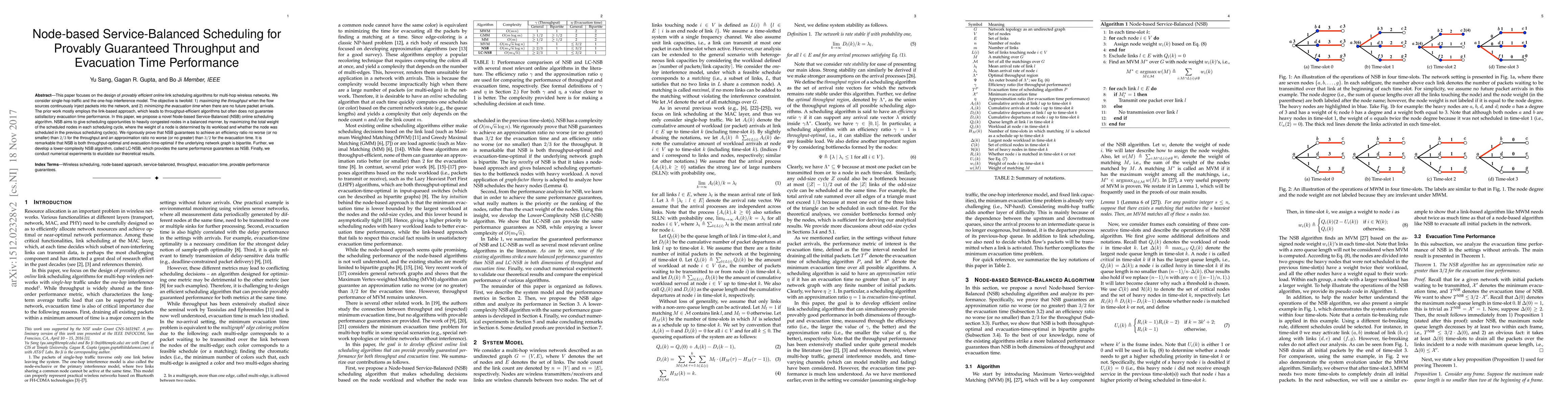 This paper proposes a Node-based Service-Balanced (NSB) online scheduling algorithm for multi-hop wireless networks to maximize throughput and minimize evacuation time. The NSB algorithm guarantees efficient throughput and evacuation time performance, with optimal results for bipartite networks, and a lower-complexity variant, LC-NSB, maintains these performance guarantees.