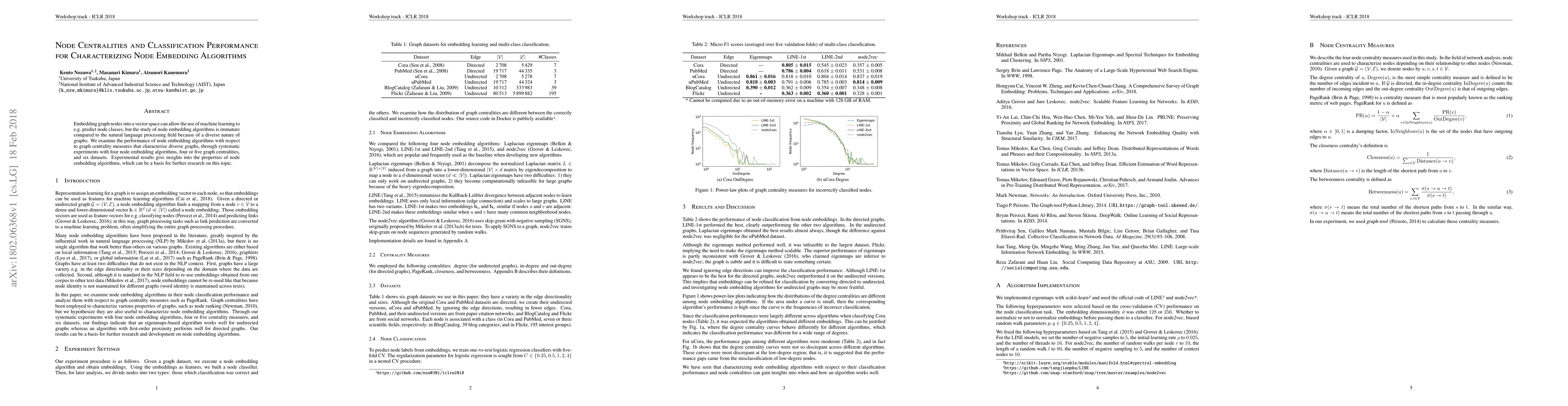 This paper explores the performance of four node embedding algorithms in relation to various graph centrality measures across six datasets, providing insights into how these algorithms function and their potential for classifying nodes, which can inform future research in this area.