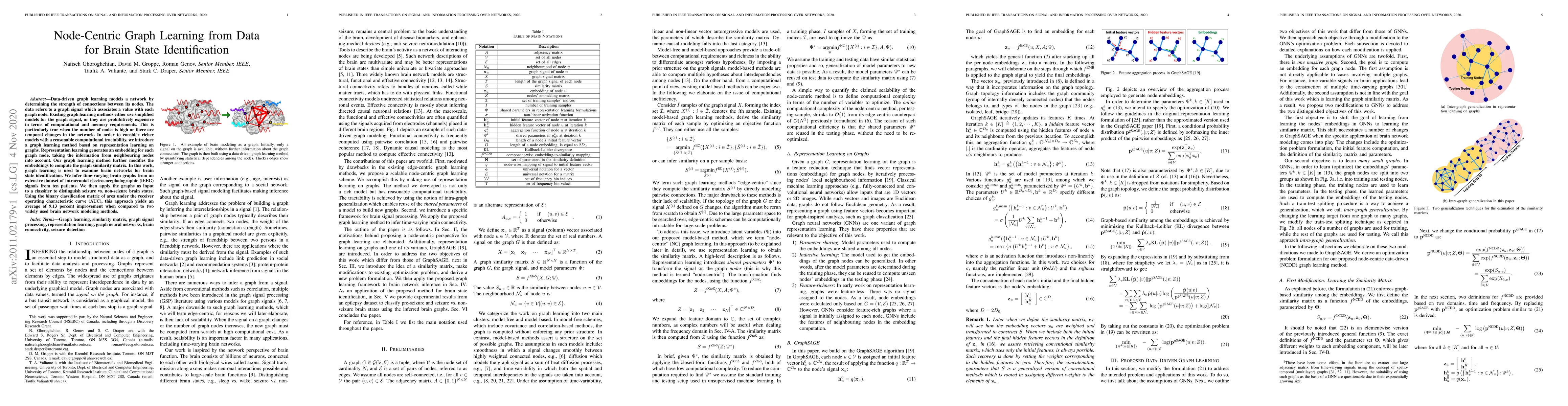Data-driven graph learning models a network by determining the strength of connections between its nodes. The data refers to a graph signal which associates a value with each graph node. Existing graph learning methods either use simplified models for the graph signal, or they are prohibitively expensive in terms of computational and memory requirements. This is particularly true when the number of nodes is high or there are temporal changes in the network. In order to consider richer models with a reasonable computational tractability, we introduce a graph learning method based on representation learning on graphs. Representation learning generates an embedding for each graph node, taking the information from neighbouring nodes into account. Our graph learning method further modifies the embeddings to compute the graph similarity matrix. In this work, graph learning is used to examine brain networks for brain state identification. We infer time-varying brain graphs from an extensive dataset of intracranial electroencephalographic (iEEG) signals from ten patients. We then apply the graphs as input to a classifier to distinguish seizure vs. non-seizure brain states. Using the binary classification metric of area under the receiver operating characteristic curve (AUC), this approach yields an average of 9.13 percent improvement when compared to two widely used brain network modeling methods.