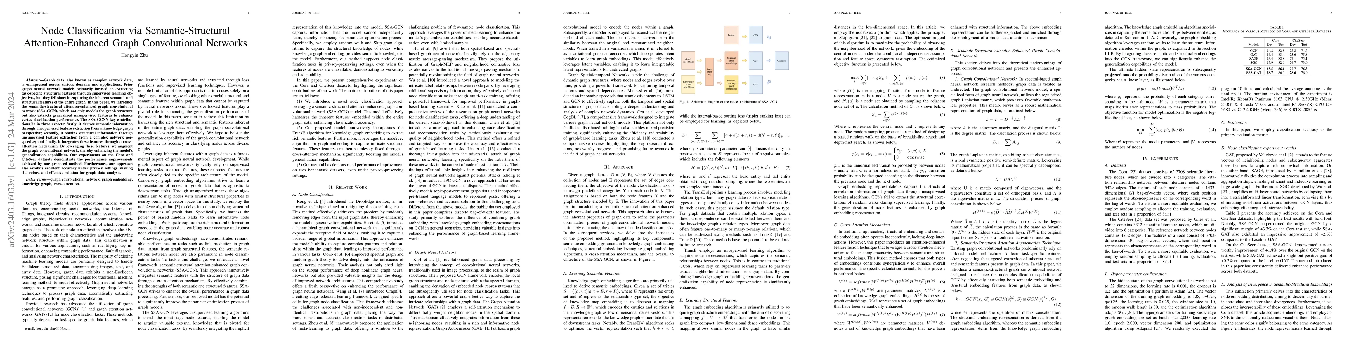 This paper proposes the Semantic-Structural Attention-Enhanced Graph Convolutional Network (SSA-GCN) to improve node classification. It integrates semantic features from knowledge graphs and structural features from complex networks, leveraging a cross-attention mechanism to enhance classification performance, and demonstrates improved accuracy on Cora and CiteSeer datasets.