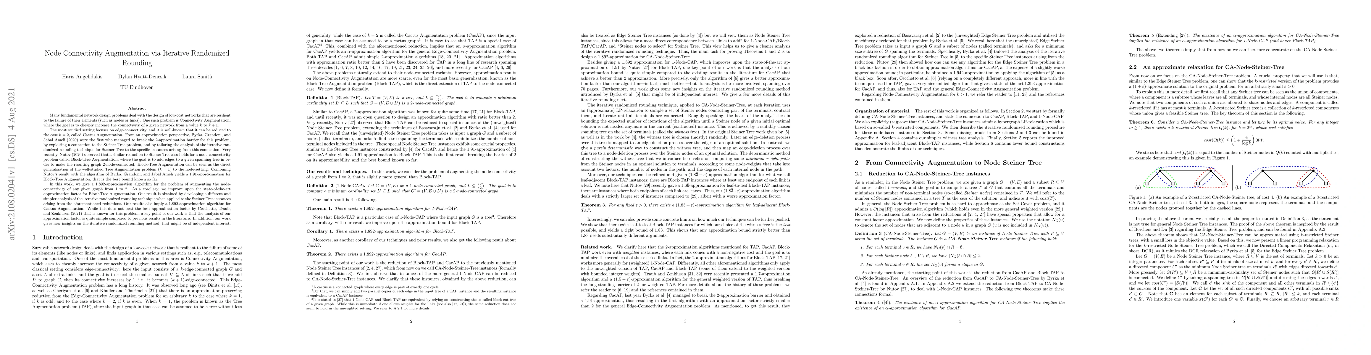 Many network design problems deal with the design of low-cost networks that are resilient to the failure of their elements, such as nodes or links. One such problem is Connectivity Augmentation, where the goal is to cheaply increase the connectivity of a network from a value k to k+1. The most studied setting focuses on edge-connectivity, which reduces to k=2, called Cactus Augmentation. From an approximation perspective, Byrka, Grandoni, and Jabal Ameli (2020) were the first to break the 2-approximation barrier for this problem, by exploiting a connection to the Steiner Tree problem, and by tailoring the analysis of the iterative randomized rounding technique for Steiner Tree to the specific instances arising from this connection. Recently, Nutov (2020) observed that a similar reduction to Steiner Tree holds for a node-connectivity problem called Block-Tree Augmentation, where the goal is to add edges to a given spanning tree so that the resulting graph 2-node-connected. Combining Nutov's result with the algorithm of Byrka, Grandoni, and Jabal Ameli yields a 1.91-approximation for Block-Tree Augmentation, that is the best bound known so far. In this work, we give a 1.892-approximation algorithm for the problem of augmenting the node-connectivity of any graph from 1 to 2. As a corollary, we improve upon the state-of-the-art approximation factor for Block-Tree Augmentation. Our result is obtained by developing a different and simpler analysis of the iterative randomized rounding technique. Our results also imply a 1.892-approximation algorithm for Cactus Augmentation. While this does not beat the best approximation by Cecchetto, Traub, and Zenklusen (2021) known for this problem, our analysis is quite simple compared to previous results in the literature. In addition, our work gives new insights on the iterative randomized rounding method, that might be of independent interest.
