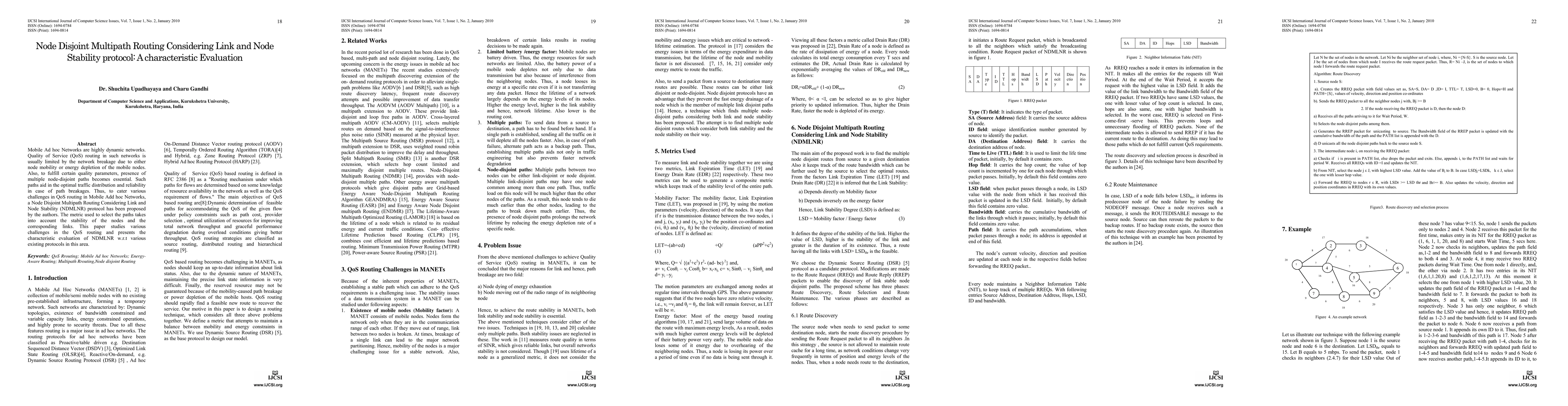 The paper proposes a Node Disjoint Multipath Routing Considering Link and Node Stability (NDMLNR) protocol for Mobile Ad hoc Networks (MANETs) to address QoS routing challenges. It uses Link Expiration Time (LET) and Energy Drain Rate (EDR) metrics to evaluate link and node stability, respectively, and modifies Dynamic Source Routing (DSR) protocol for route discovery, selection, and maintenance.
