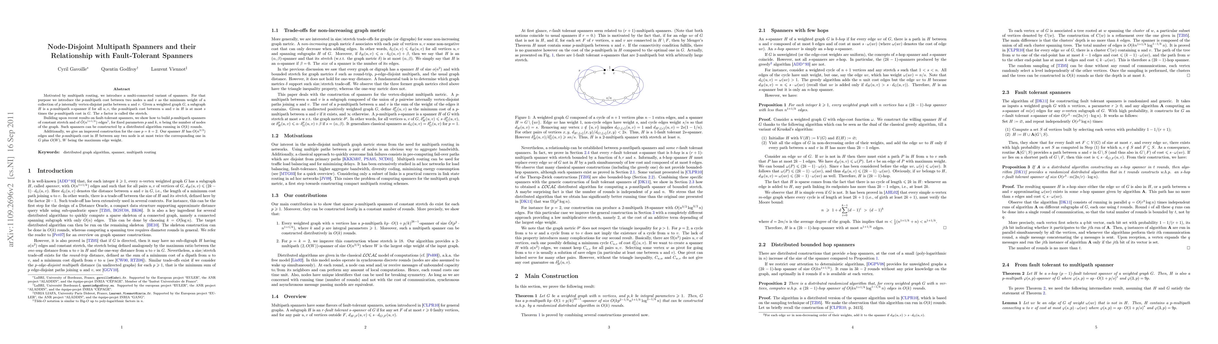 Motivated by multipath routing, we introduce a multi-connected variant of spanners. For that purpose we introduce the $p$-multipath cost between two nodes $u$ and $v$ as the minimum weight of a collection of $p$ internally vertex-disjoint paths between $u$ and $v$. Given a weighted graph $G$, a subgraph $H$ is a $p$-multipath $s$-spanner if for all $u,v$, the $p$-multipath cost between $u$ and $v$ in $H$ is at most $s$ times the $p$-multipath cost in $G$. The $s$ factor is called the stretch. Building upon recent results on fault-tolerant spanners, we show how to build $p$-multipath spanners of constant stretch and of $\tO(n^{1+1/k})$ edges, for fixed parameters $p$ and $k$, $n$ being the number of nodes of the graph. Such spanners can be constructed by a distributed algorithm running in $O(k)$ rounds. Additionally, we give an improved construction for the case $p=k=2$. Our spanner $H$ has $O(n^{3/2})$ edges and the $p$-multipath cost in $H$ between any two node is at most twice the corresponding one in $G$ plus $O(W)$, $W$ being the maximum edge weight.