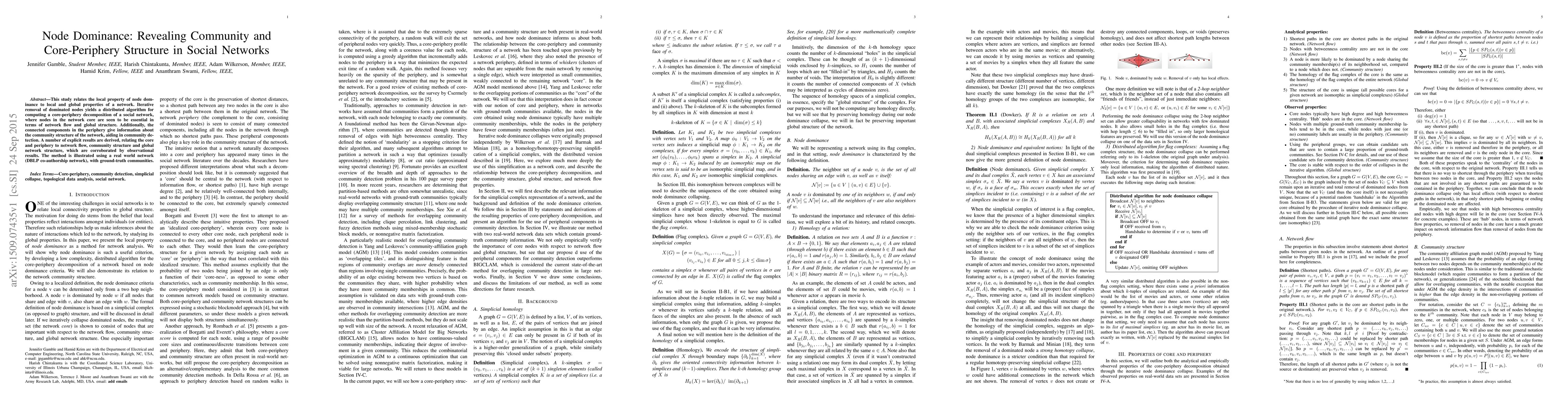 This study introduces a distributed algorithm for core-periphery decomposition in social networks based on node dominance, revealing essential nodes and community structures. The method is validated using the DBLP co-authorship network, demonstrating its effectiveness in uncovering network flow and global structure.