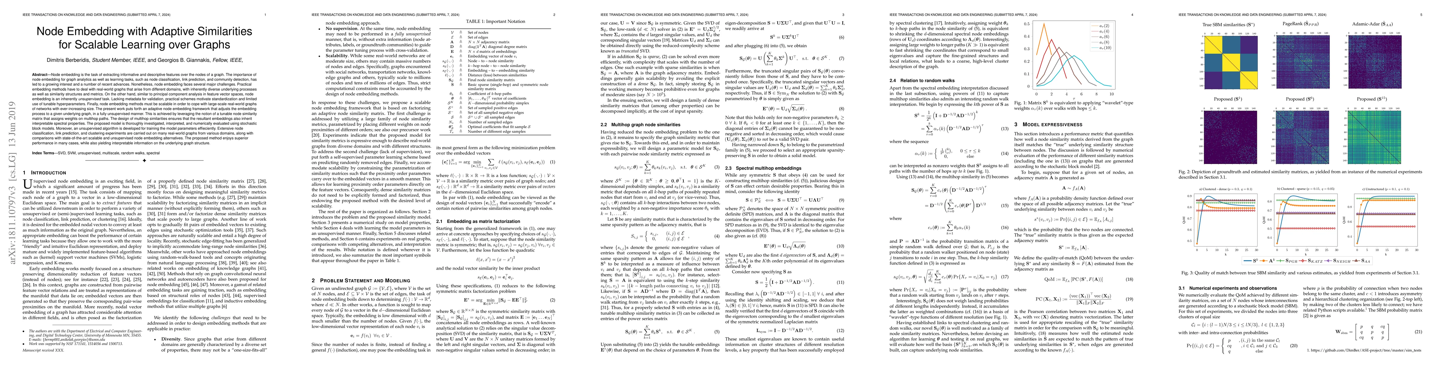 This paper proposes an adaptive node embedding framework that uses tunable node similarity matrices to generate scalable, unsupervised embeddings for large-scale graphs. The method achieves superior performance in tasks like node classification and link prediction while maintaining interpretable spectral properties.