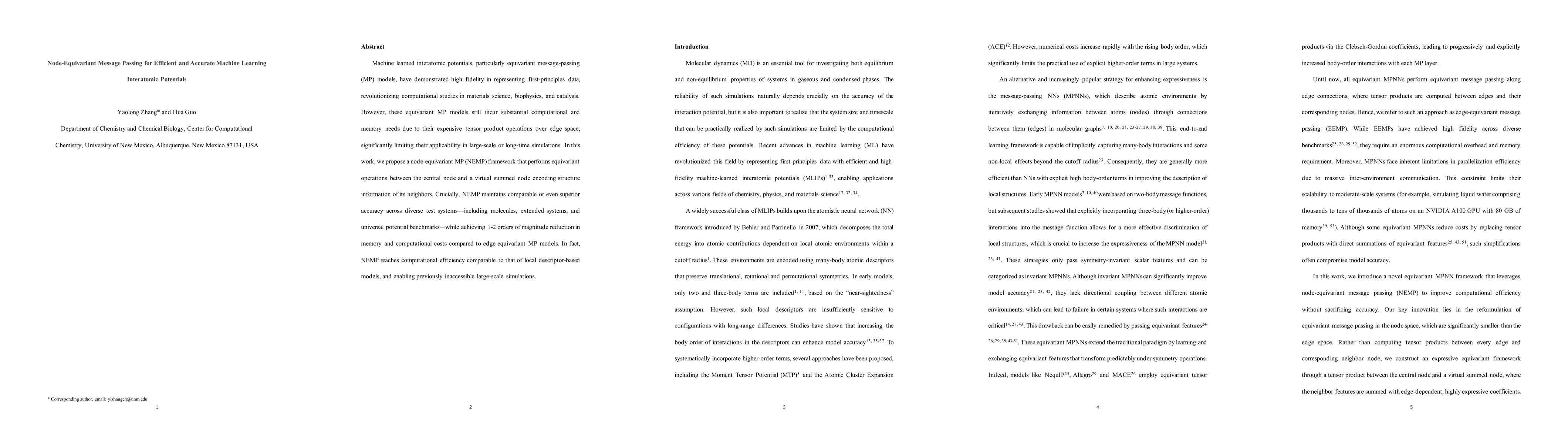 Machine learned interatomic potentials, particularly equivariant message-passing (MP) models, have demonstrated high fidelity in representing first-principles data, revolutionizing computational studies in materials science, biophysics, and catalysis. However, these equivariant MP models still incur substantial computational and memory needs due to their expensive tensor product operations over edge space, significantly limiting their applicability in large-scale or long-time simulations. In this work, we propose a node-equivariant MP (NEMP) framework that performs equivariant operations between the central node and a virtual summed node encoding structure information of its neighbors. Crucially, NEMP maintains comparable or even superior accuracy across diverse test systems-including molecules, extended systems, and universal potential benchmarks-while achieving 1-2 orders of magnitude reduction in memory and computational costs compared to edge equivariant MP models. In fact, NEMP reaches computational efficiency comparable to that of local descriptor-based models, and enabling previously inaccessible large-scale simulations.