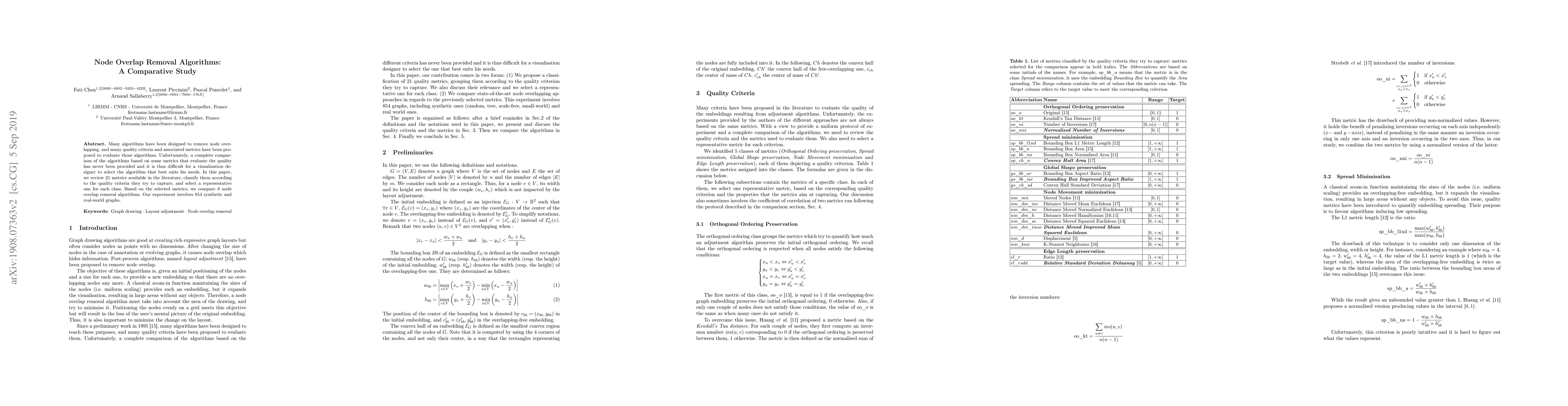 Many algorithms have been designed to remove node overlapping, and many quality criteria and associated metrics have been proposed to evaluate those algorithms. Unfortunately, a complete comparison of the algorithms based on some metrics that evaluate the quality has never been provided and it is thus difficult for a visualization designer to select the algorithm that best suits his needs. In this paper, we review 21 metrics available in the literature, classify them according to the quality criteria they try to capture, and select a representative one for each class. Based on the selected metrics, we compare 8 node overlap removal algorithms. Our experiment involves 854 synthetic and real-world graphs.