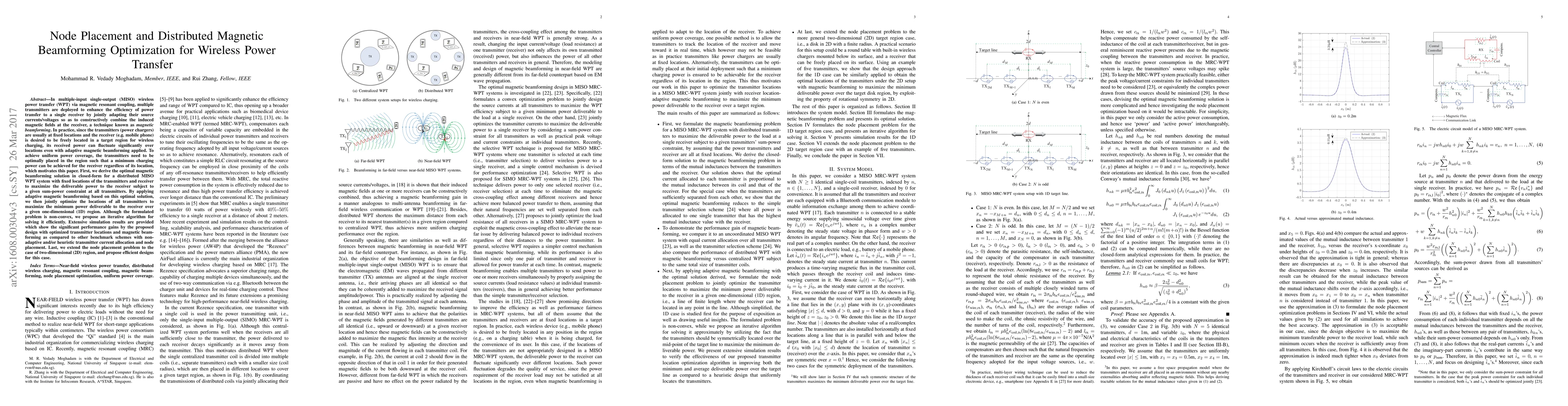 This paper optimizes node placement and magnetic beamforming for MISO wireless power transfer via magnetic resonant coupling. It derives the optimal beamforming solution and proposes an iterative algorithm to jointly optimize transmitter locations for uniform power coverage over a one-dimensional region, achieving significant performance gains over benchmark schemes.