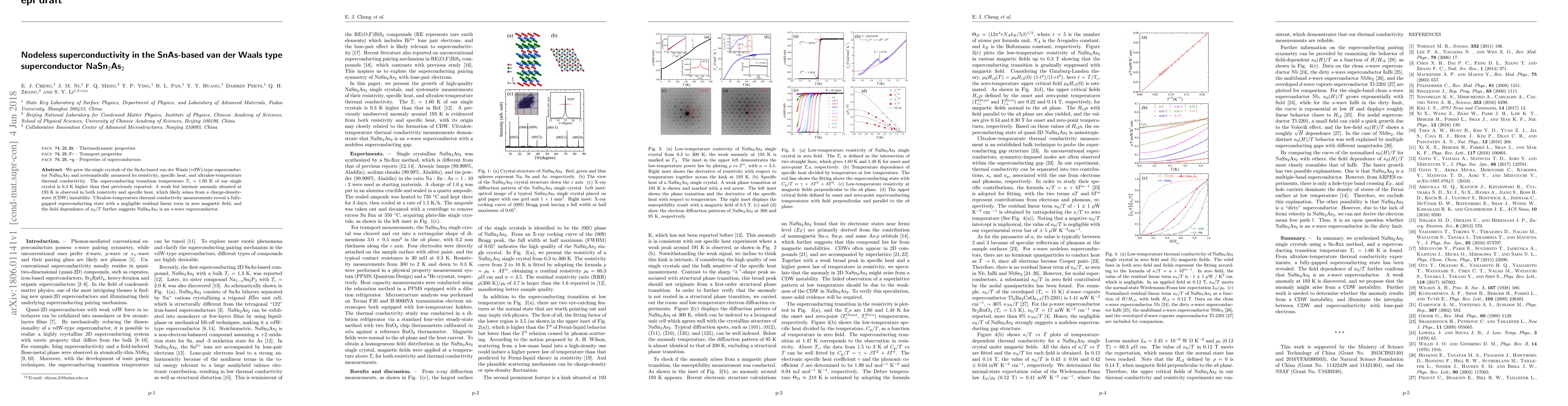 The paper reports on single crystal growth and characterization of NaSn2As2, a SnAs-based van der Waals superconductor with a higher-than-previously-reported Tc of 1.60 K. Anomalies suggest a charge-density-wave instability around 193 K. Thermal conductivity measurements indicate a full gap superconducting state with s-wave symmetry and negligible residual linear term in zero field.