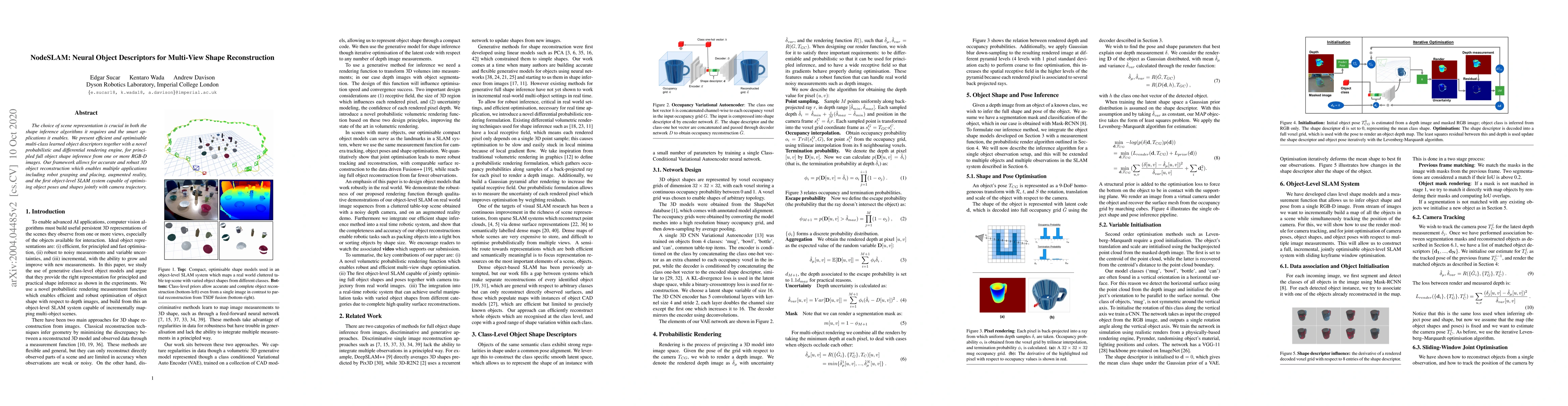 NodeSLAM introduces neural object descriptors and a probabilistic rendering engine for accurate multi-view shape reconstruction from RGB-D images. This framework enables applications like robot grasping, augmented reality, and an object-level SLAM system optimizing object poses and shapes with camera trajectory.