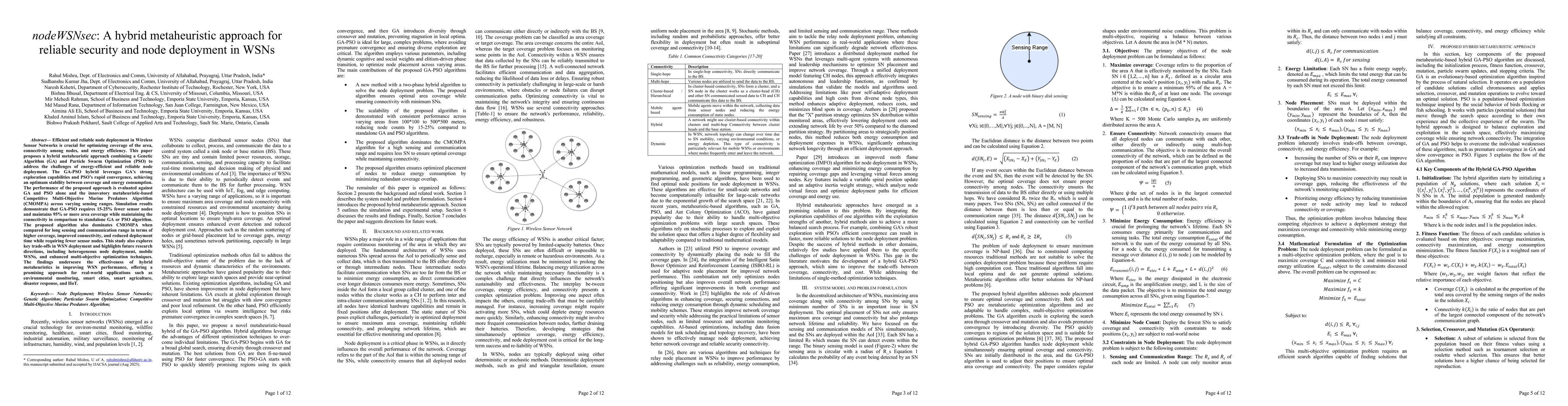 Efficient and reliable node deployment in Wireless Sensor Networks is crucial for optimizing coverage of the area, connectivity among nodes, and energy efficiency. This paper proposes a hybrid meta heuristic approach combining a Genetic Algorithm (GA) and Particle Swarm Optimization (PSO) to address the challenges of energy efficient and reliable node deployment. The GA PSO hybrid leverages GAs strong exploration capabilities and PSOs rapid convergence, achieving an optimum stability between coverage and energy consumption. The performance of the proposed approach is evaluated against GA and PSO alone and the innovatory meta heuristic based Competitive Multi Objective Marine Predators Algorithm (CMOMPA) across varying sensing ranges. Simulation results demonstrate that GA PSO requires 15% to 25% fewer sensor nodes and maintains 95% or more area coverage while maintaining the connectivity in comparison to standalone GA or PSO algorithm. The proposed algorithm also dominates CMOMPA when compared for long sensing and communication range in terms of higher coverage, improved connectivity, and reduced deployment time while requiring fewer sensor nodes. This study also explores key trade offs in WSN deployment and highlights future research directions, including heterogeneous node deployment, mobile WSNs, and enhanced multi objective optimization techniques. The findings underscore the effectiveness of hybrid meta heuristics in improving WSN performance, offering a promising approach for real world applications such as environmental monitoring, smart cities, smart agriculture, disaster response, and IIoT.