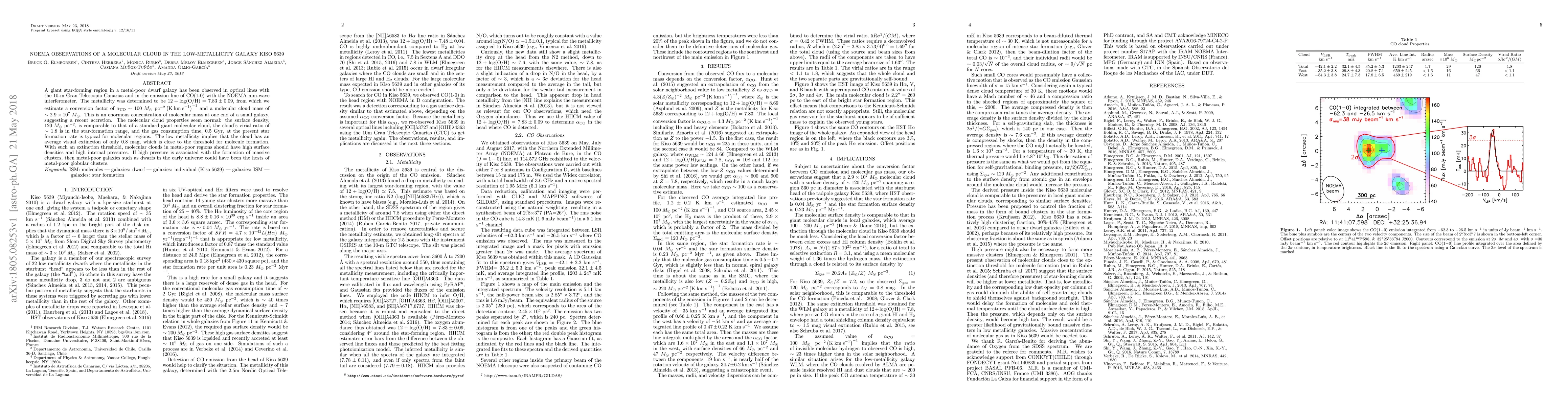 The NOEMA observations of a molecular cloud in the low-metallicity galaxy Kiso 5639 reveal a star-forming region with a metallicity of 12+log(O/H)=7.83±0.09, suggesting a molecular cloud mass of ~2.9x10^7 Msun. The cloud's properties indicate normal star-formation conditions despite its low metallicity, hinting at the potential for massive cluster formation in such environments.