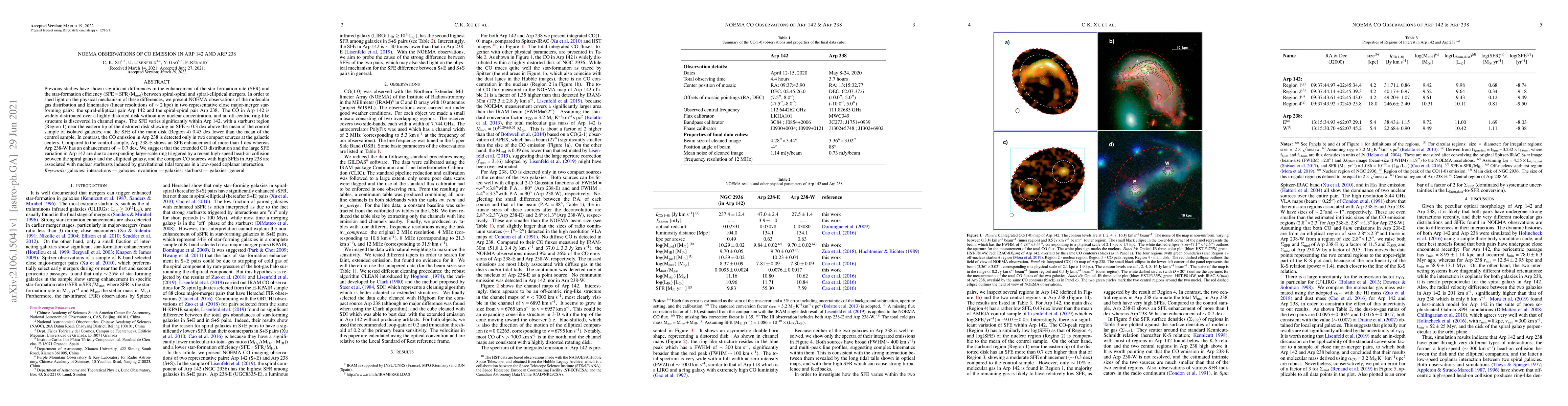 The NOEMA observations reveal distinct molecular gas distributions and kinematics in Arp142 (spiral-elliptical merger) and Arp238 (spiral-spiral merger). Arp142 exhibits an extended, distorted CO disk with a ring-like structure, suggesting an expanding ring from a high-speed collision, while Arp238 displays compact CO sources at galactic centers, indicating nuclear starbursts from low-speed gravitational torques.