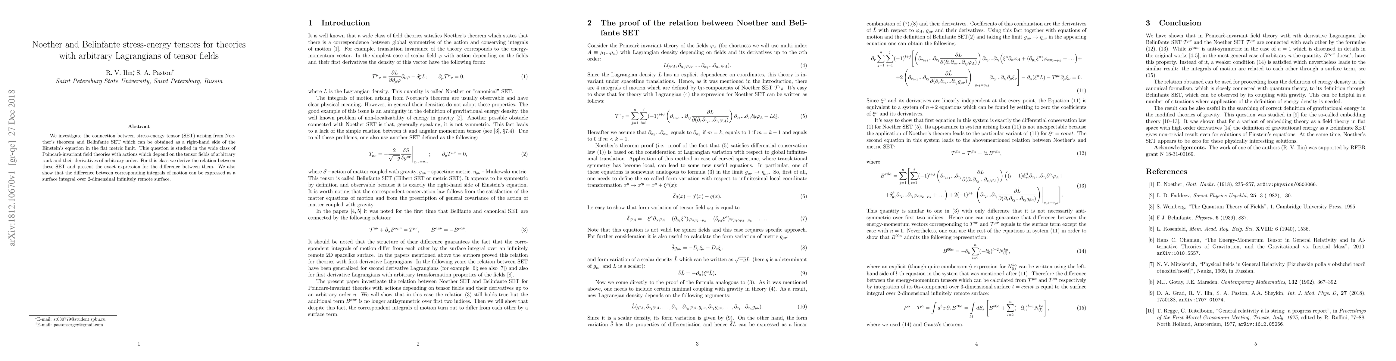 We investigate the connection between stress-energy tensor (SET) arising from Noether's theorem and Belinfante SET which can be obtained as a right-hand side of the Einstein's equation in the flat metric limit. This question is studied in the wide class of Poincar\`e-invariant field theories with actions which depend on the tensor fields of arbitrary rank and their derivatives of arbitrary order. For this class we derive the relation between these SET and present the exact expression for the difference between them. We also show that the difference between corresponding integrals of motion can be expressed as a surface integral over 2-dimensinal infinitely remote surface.