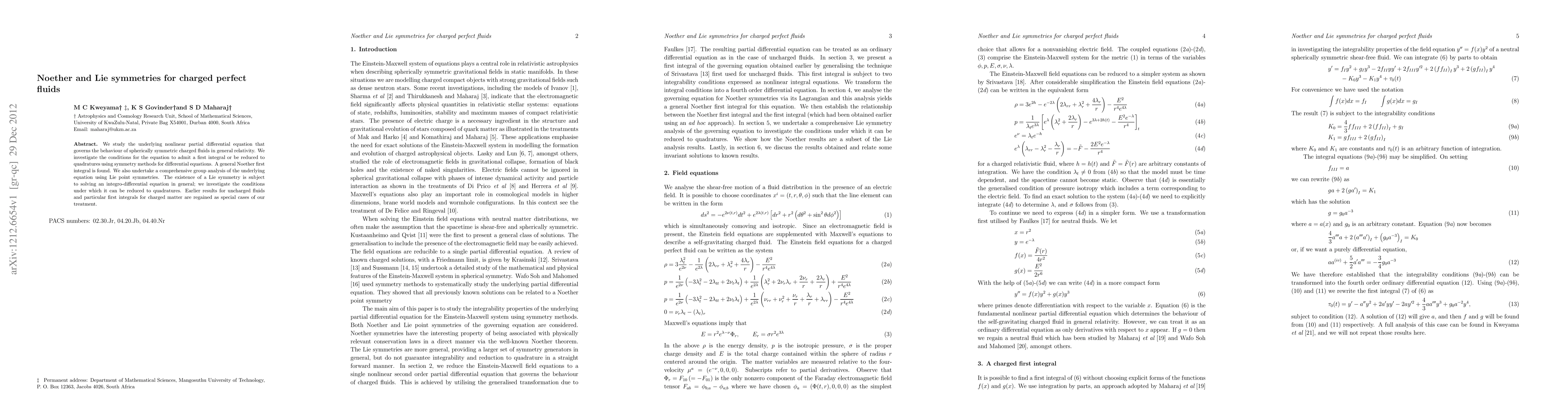 The paper presents a detailed Noether and Lie symmetry analysis for charged perfect fluids, providing a general Noether first integral and conditions for Lie point symmetries reduction to quadratures.