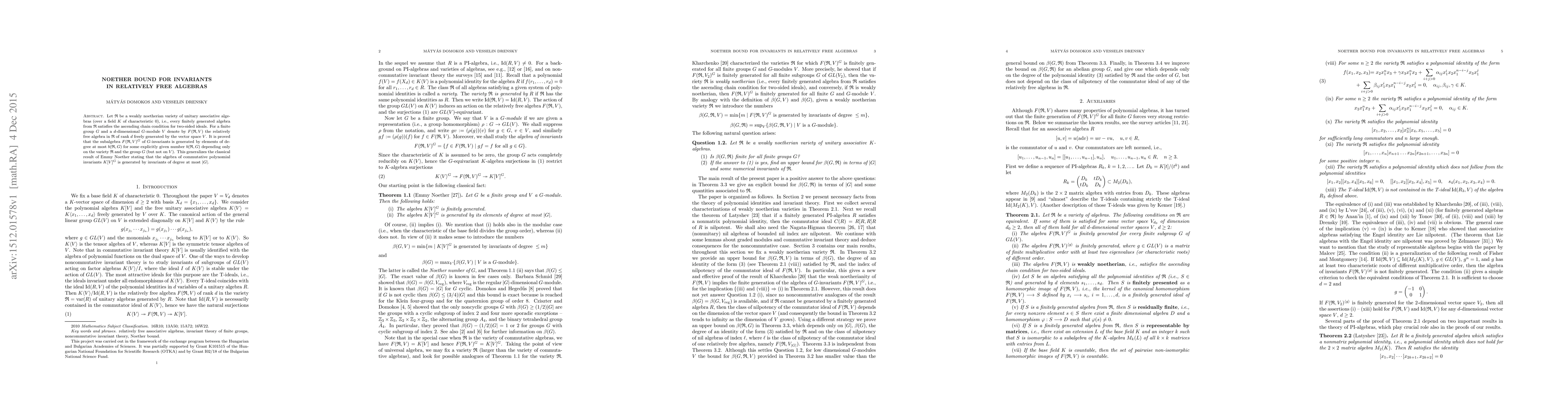Let $\mathfrak{R}$ be a weakly noetherian variety of unitary associative algebras (over a field $K$ of characteristic 0), i.e., every finitely generated algebra from $\mathfrak{R}$ satisfies the ascending chain condition for two-sided ideals. For a finite group $G$ and a $d$-dimensional $G$-module $V$ denote by $F({\mathfrak R},V)$ the relatively free algebra in $\mathfrak{R}$ of rank $d$ freely generated by the vector space $V$. It is proved that the subalgebra $F({\mathfrak R},V)^G$ of $G$-invariants is generated by elements of degree at most $b(\mathfrak{R},G)$ for some explicitly given number $b(\mathfrak{R},G)$ depending only on the variety $\mathfrak{R}$ and the group $G$ (but not on $V$). This generalizes the classical result of Emmy Noether stating that the algebra of commutative polynomial invariants $K[V]^G$ is generated by invariants of degree at most $\vert G\vert$.