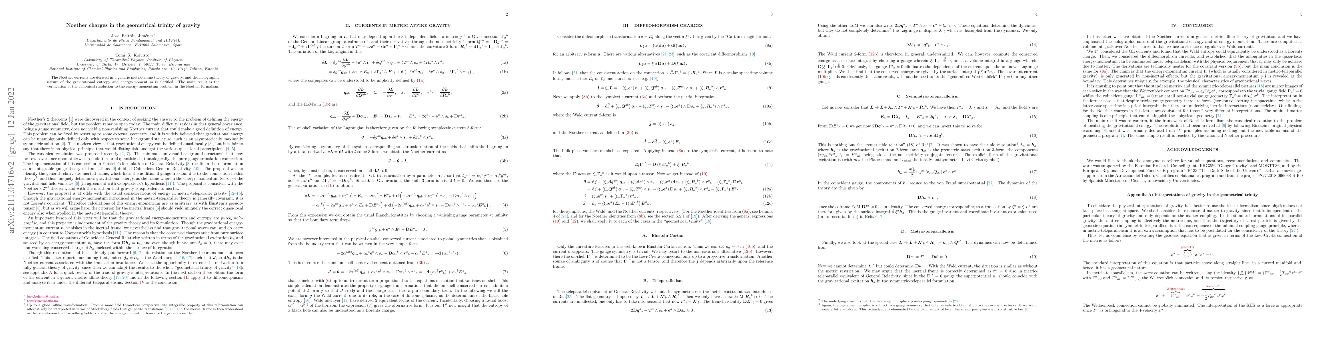 This paper derives Noether currents in a metric-affine gravity framework, clarifying the holographic nature of gravitational entropy and energy-momentum. It verifies the canonical resolution to the energy-momentum problem within the Noether formalism.