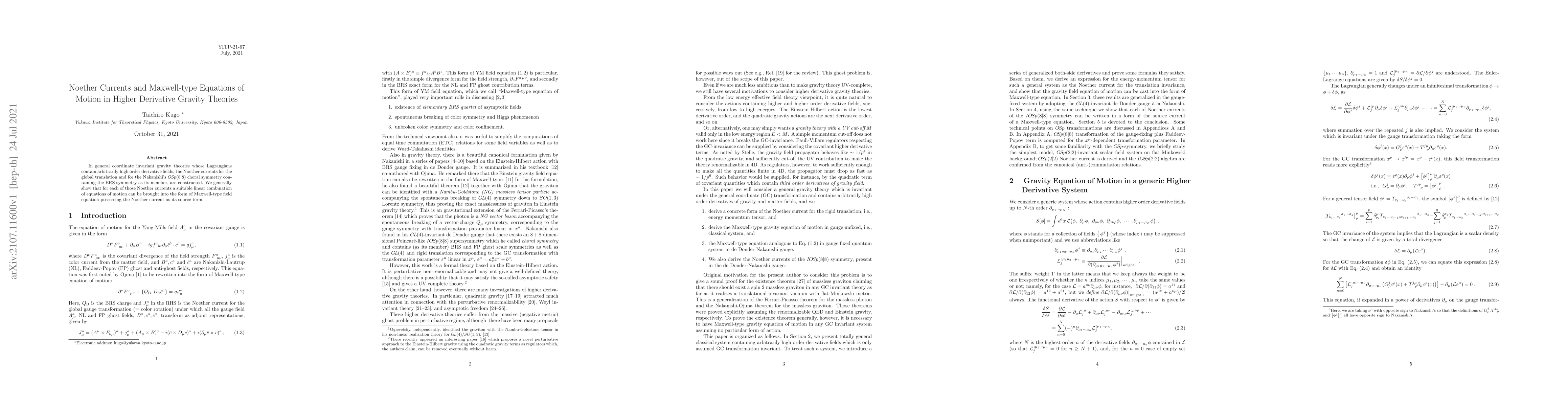 In general coordinate invariant gravity theories whose Lagrangians contain arbitrarily high order derivative fields, the Noether currents for the global translation and for the Nakanishi's IOSp(8|8) choral symmetry containing the BRS symmetry as its member, are constructed. We generally show that for each of those Noether currents a suitable linear combination of equations of motion can be brought into the form of Maxwell-type field equation possessing the Noether current as its source term.