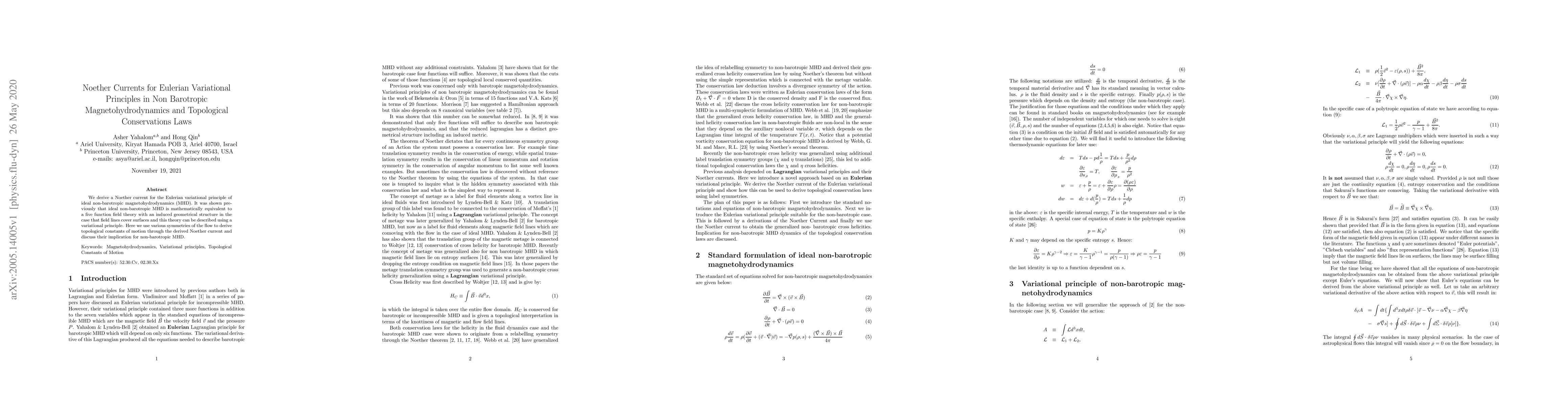 We derive a Noether current for the Eulerian variational principle of ideal non-barotropic magnetohydrodynamics (MHD). It was shown previously that ideal non-barotropic MHD is mathematically equivalent to a five function field theory with an induced geometrical structure in the case that field lines cover surfaces and this theory can be described using a variational principle. Here we use various symmetries of the flow to derive topological constants of motion through the derived Noether current and discuss their implication for non-barotropic MHD.