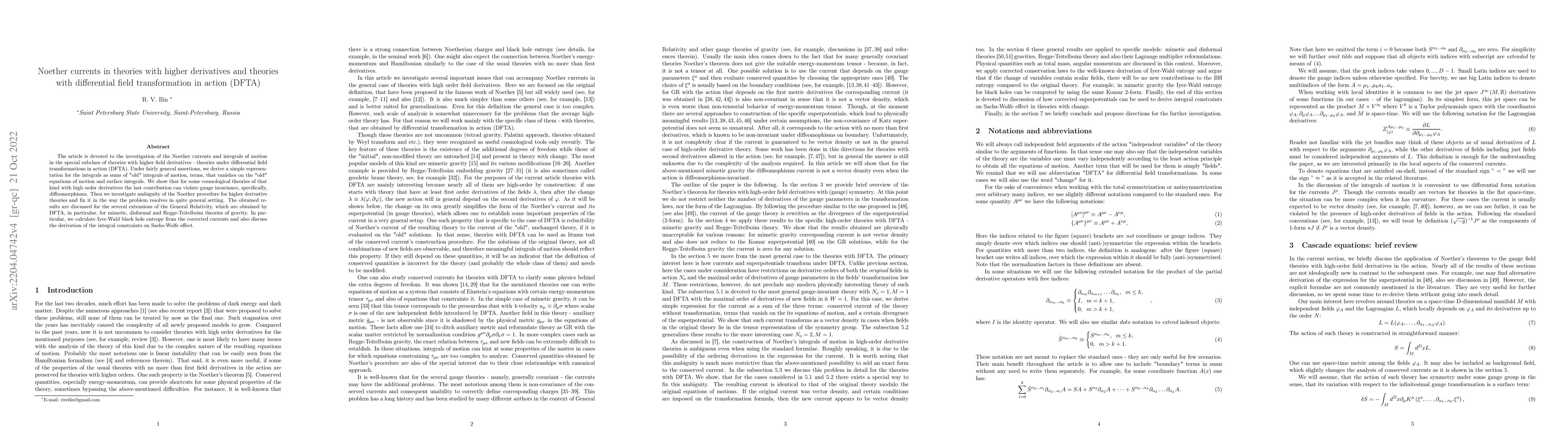 This paper investigates Noether currents and integrals of motion in theories with higher derivatives under differential field transformations in action (DFTA), deriving a representation for these integrals. It also addresses the violation of gauge invariance by surface integrals in certain high-order derivative cosmological theories and resolves the ambiguity in the Noether procedure for higher derivative theories.