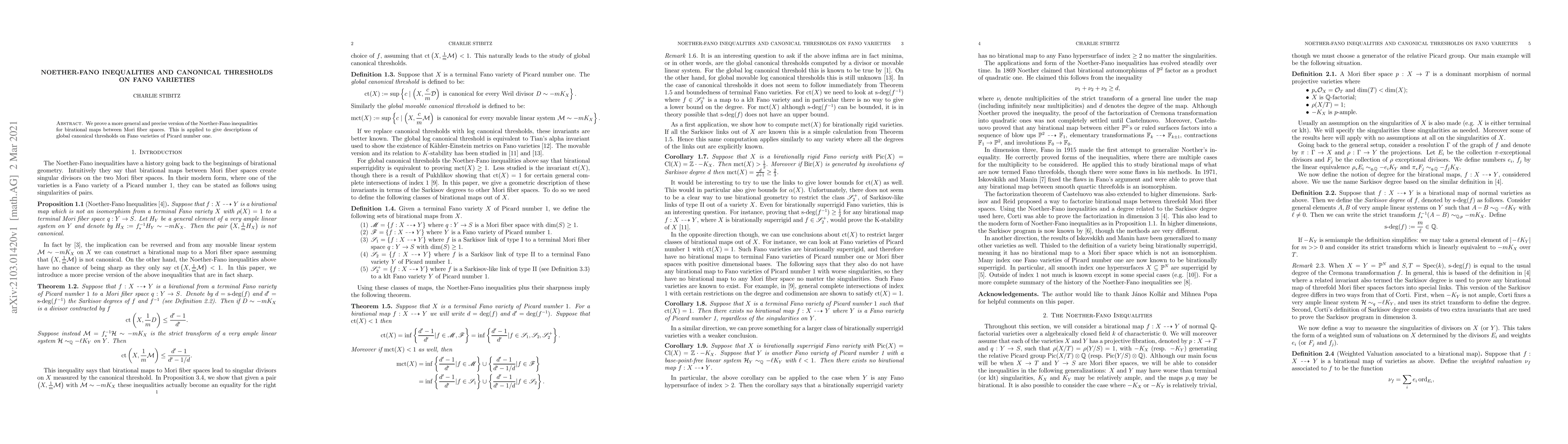 This paper presents a refined version of the Noether-Fano inequalities for birational maps between Mori fiber spaces, which is then utilized to elucidate global canonical thresholds on Fano varieties with a Picard number of one.