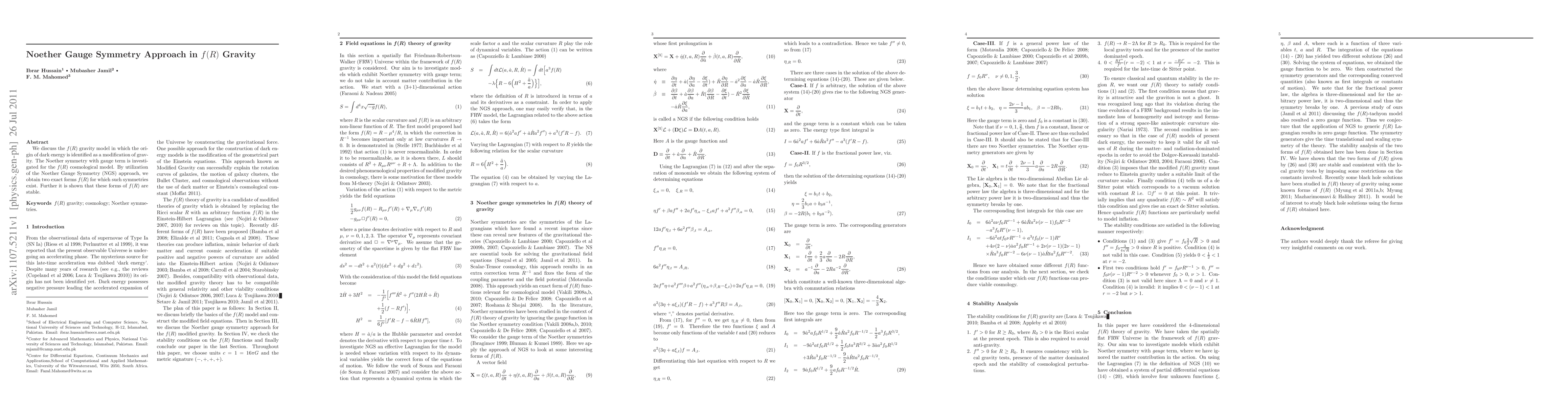 This paper explores the f(R) gravity model where dark energy arises from gravitational modifications, applying the Noether Gauge Symmetry approach to uncover two exact f(R) forms with inherent symmetries, confirming their stability.