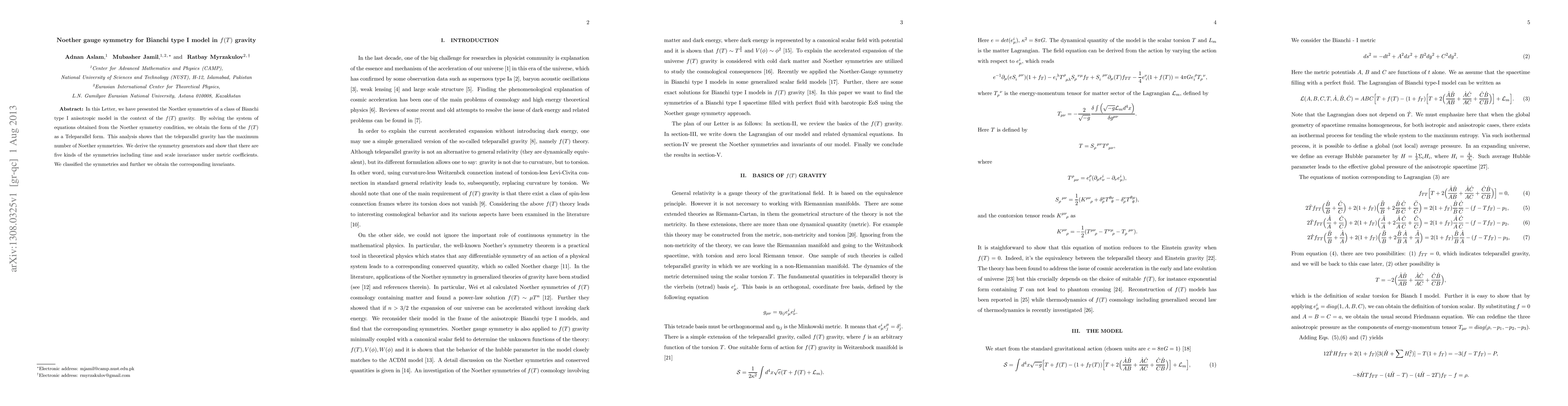 This paper investigates the Noether symmetries of a Bianchi type I model in the framework of f(T) gravity, revealing that teleparallel gravity possesses the maximum number of such symmetries. The study identifies five types of symmetries, including time and scale invariance, and derives corresponding invariants.