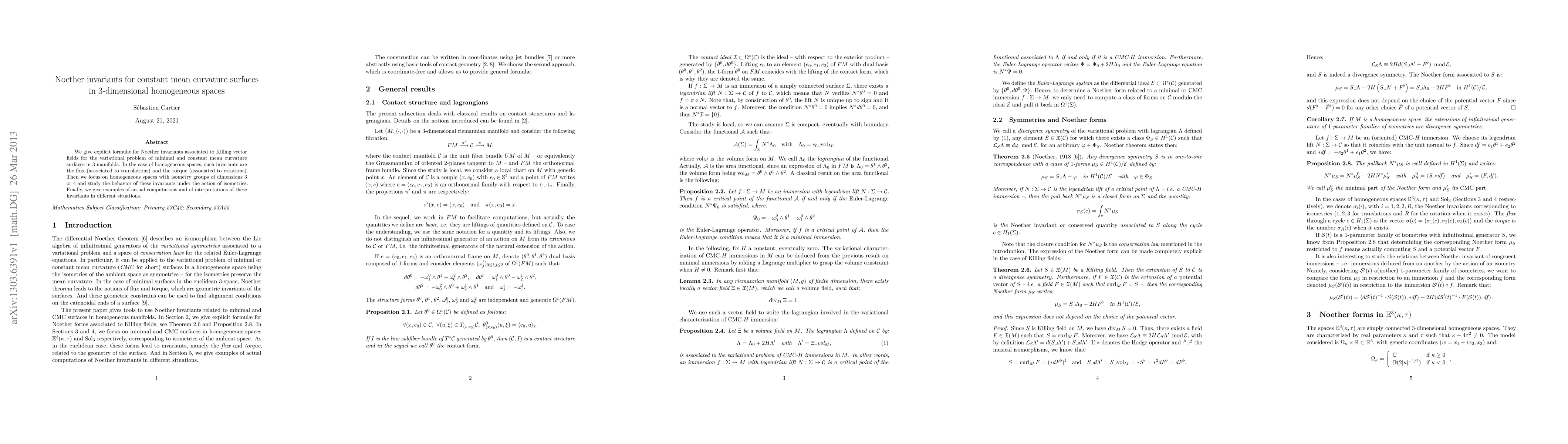 This paper provides explicit formulas for Noether invariants related to Killing vector fields for minimal and constant mean curvature surfaces in 3-manifolds, focusing on homogeneous spaces and analyzing the behavior of these invariants under isometry actions. It includes examples of computations and interpretations of these invariants.
