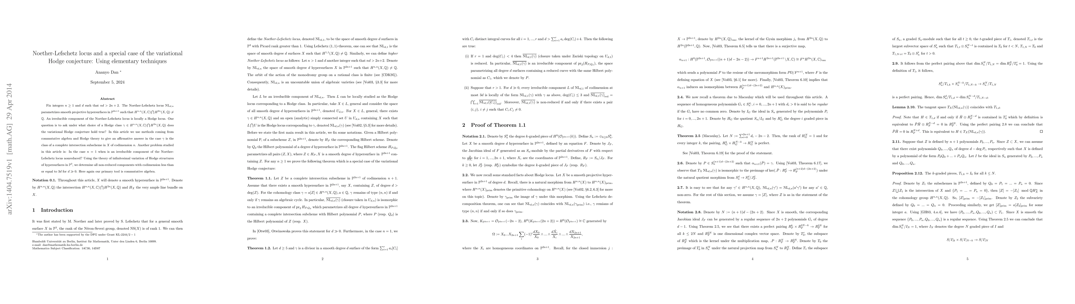 This paper investigates the Noether-Lefschetz locus of degree $d$ hypersurfaces in $\mathbb{P}^{2n+1}$ where the Hodge structure on $H^{2n}$ is non-trivial. It demonstrates that the variational Hodge conjecture holds for complete intersection subschemes of codimension $n+1$ and degree less than $d$, using commutative algebra techniques.