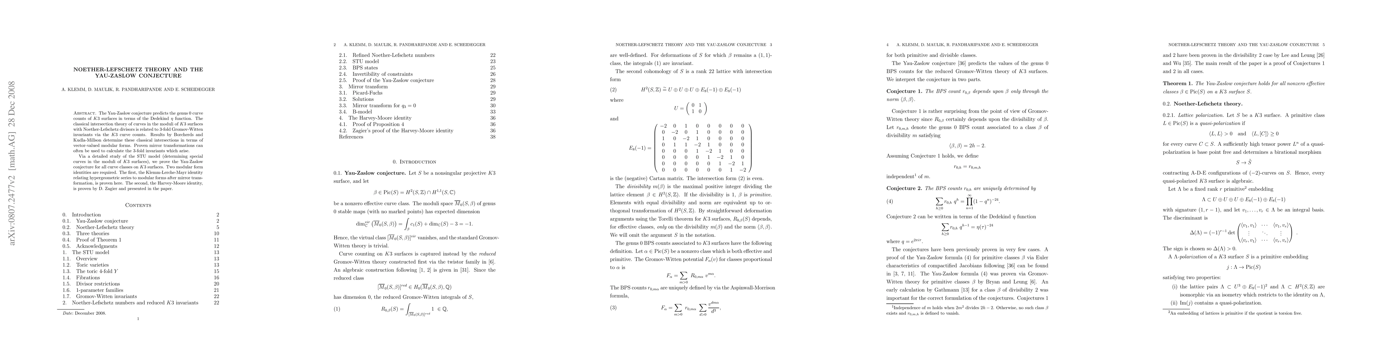 This paper proves the Yau-Zaslow conjecture for K3 surfaces by linking classical intersections in moduli space to 3-fold Gromov-Witten invariants, utilizing the STU model and mirror transformations. Key modular form identities, including the newly proven Klemm-Lerche-Mayr identity, are essential to the proof.