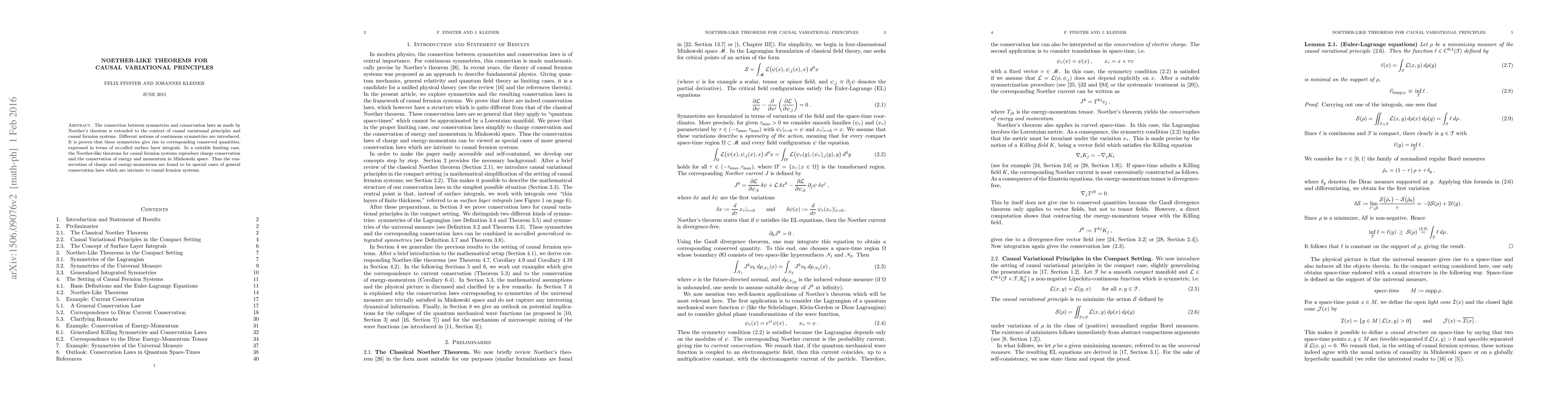 This paper extends Noether's theorem to causal variational principles, demonstrating that continuous symmetries in causal fermion systems lead to conserved quantities, including charge conservation and energy-momentum conservation in Minkowski space. These results reveal that charge and energy-momentum conservation are special instances of broader conservation laws inherent in causal fermion systems.