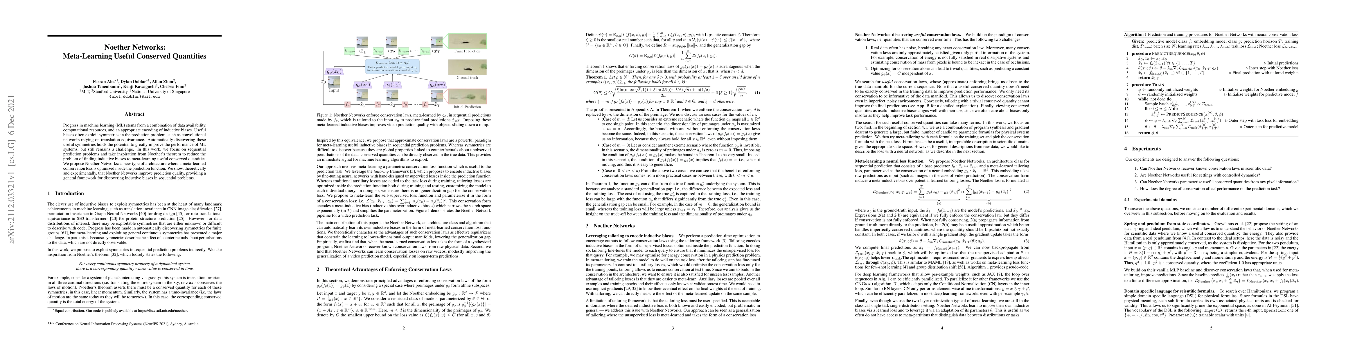 Progress in machine learning (ML) stems from a combination of data availability, computational resources, and an appropriate encoding of inductive biases. Useful biases often exploit symmetries in the prediction problem, such as convolutional networks relying on translation equivariance. Automatically discovering these useful symmetries holds the potential to greatly improve the performance of ML systems, but still remains a challenge. In this work, we focus on sequential prediction problems and take inspiration from Noether's theorem to reduce the problem of finding inductive biases to meta-learning useful conserved quantities. We propose Noether Networks: a new type of architecture where a meta-learned conservation loss is optimized inside the prediction function. We show, theoretically and experimentally, that Noether Networks improve prediction quality, providing a general framework for discovering inductive biases in sequential problems.