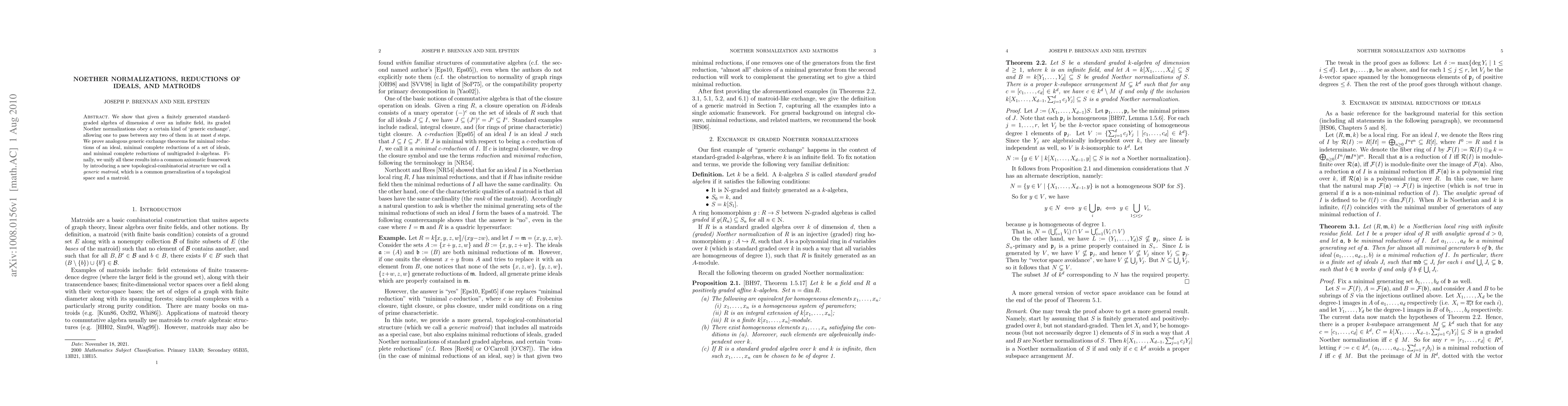 We show that given a finitely generated standard-graded algebra of dimension $d$ over an infinite field, its graded Noether normalizations obey a certain kind of `generic exchange', allowing one to pass between any two of them in at most $d$ steps. We prove analogous generic exchange theorems for minimal reductions of an ideal, minimal complete reductions of a set of ideals, and minimal complete reductions of multigraded $k$-algebras. Finally, we unify all these results into a common axiomatic framework by introducing a new topological-combinatorial structure we call a generic matroid, which is a common generalization of a topological space and a matroid.