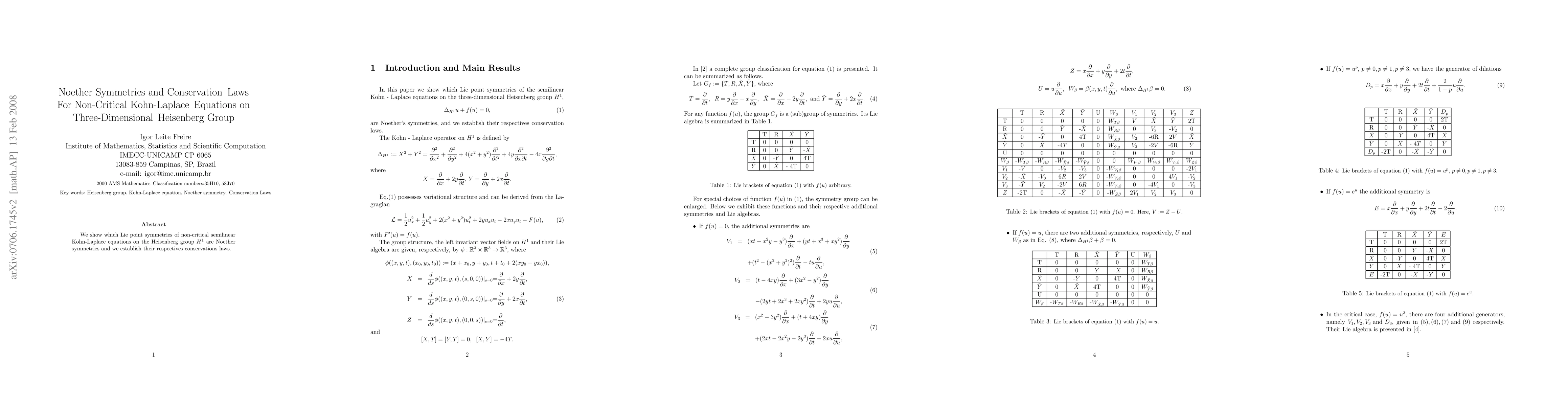 We show which Lie point symmetries of non-critical semilinear Kohn-Laplace equations on the Heisenberg group $H^1$ are Noether symmetries and we establish their respectives conservations laws.