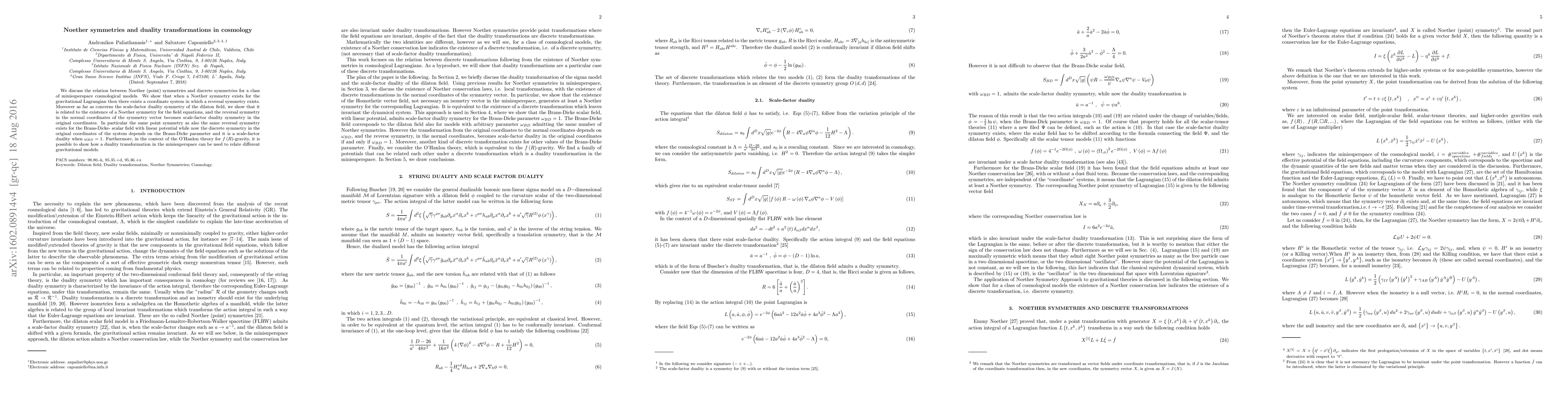 We discuss the relation between Noether (point) symmetries and discrete symmetries for a class of minisuperspace cosmological models. We show that when a Noether symmetry exists for the gravitational Lagrangian then there exists a coordinate system in which a reversal symmetry exists. Moreover as far as concerns the scale-factor duality symmetry of the dilaton field, we show that it is related to the existence of a Noether symmetry for the field equations, and the reversal symmetry in the normal coordinates of the symmetry vector becomes scale-factor duality symmetry in the original coordinates. In particular the same point symmetry as also the same reversal symmetry exists for the Brans-Dicke- scalar field with linear potential while now the discrete symmetry in the original coordinates of the system depends on the Brans-Dicke parameter and it is a scale-factor duality when $\omega_{BD}=1$. Furthermore, in the context of the O'Hanlon theory for $f\left( R\right) $-gravity, it is possible to show how a duality transformation in the minisuperspace can be used to relate different gravitational models.