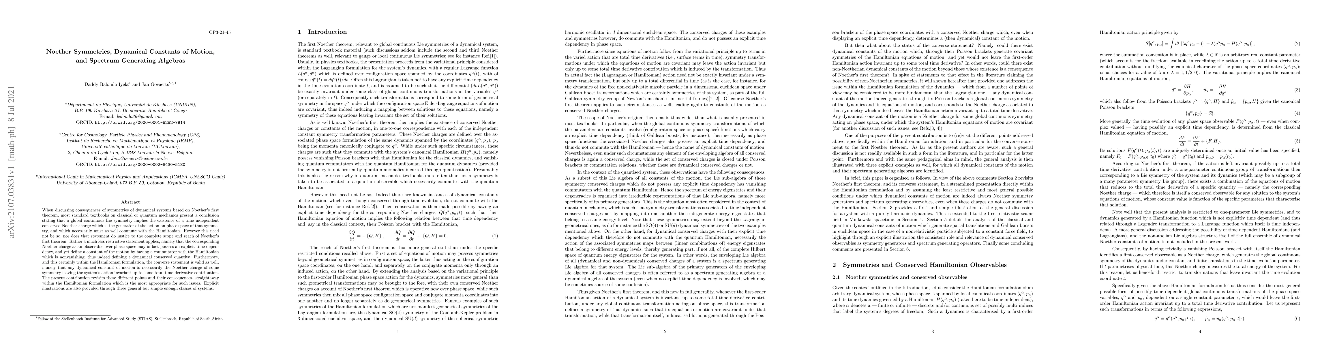 A research paper revisits Noether's first theorem, showing that a global continuous Lie symmetry doesn't necessarily imply a time-independent conserved charge; rather, any dynamical constant of motion can be the Noether charge of some symmetry.