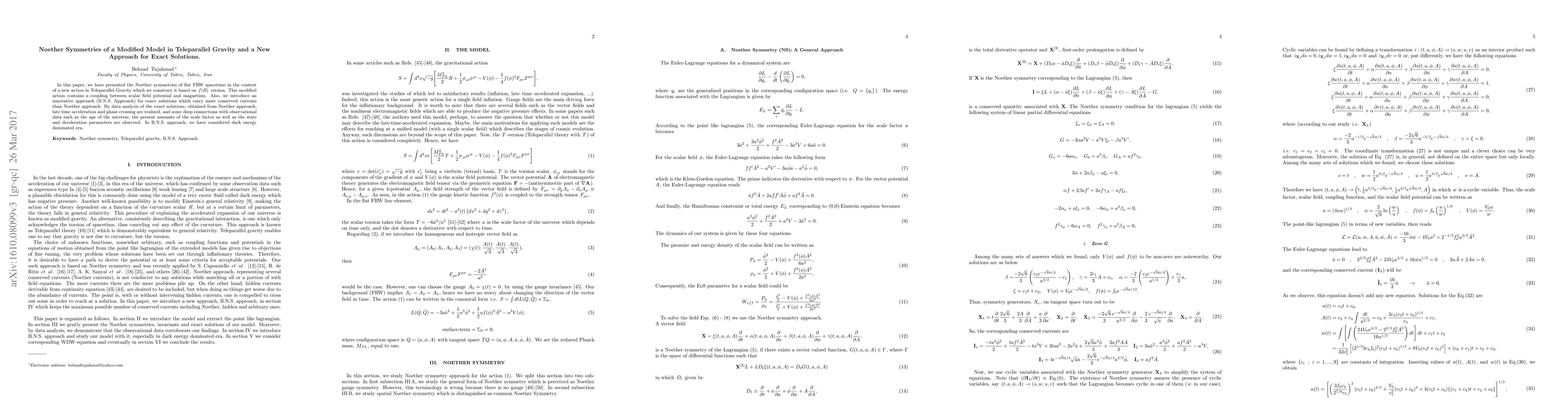 This paper explores Noether symmetries in a modified Teleparallel Gravity model based on an $f(R)$ action, introducing a coupling between scalar field potential and magnetism. It proposes a new B.N.S. approach for exact solutions generating more conserved currents, revealing late time acceleration and connections to observational data, including the universe's age and scale factor.