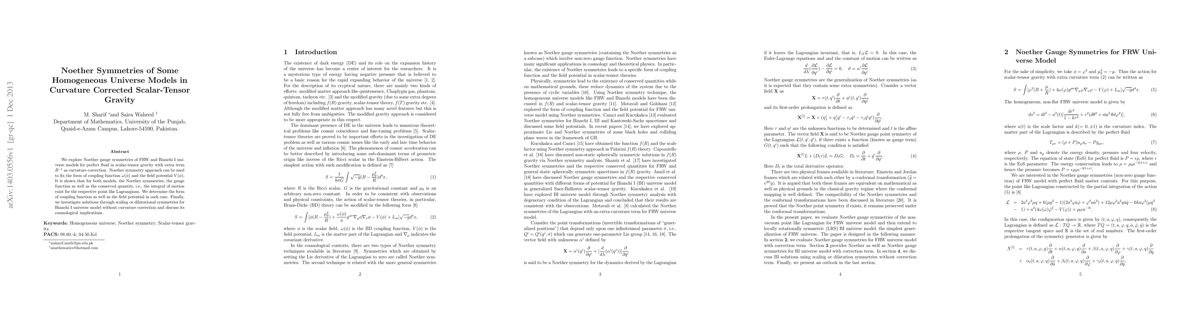 We explore Noether gauge symmetries of FRW and Bianchi I universe models for perfect fluid in scalar-tensor gravity with extra term $R^{-1}$ as curvature correction. Noether symmetry approach can be used to fix the form of coupling function $\omega(\phi)$ and the field potential $V(\phi)$. It is shown that for both models, the Noether symmetries, the gauge function as well as the conserved quantity, i.e., the integral of motion exist for the respective point like Lagrangians. We determine the form of coupling function as well as the field potential in each case. Finally, we investigate solutions through scaling or dilatational symmetries for Bianchi I universe model without curvature correction and discuss its cosmological implications.