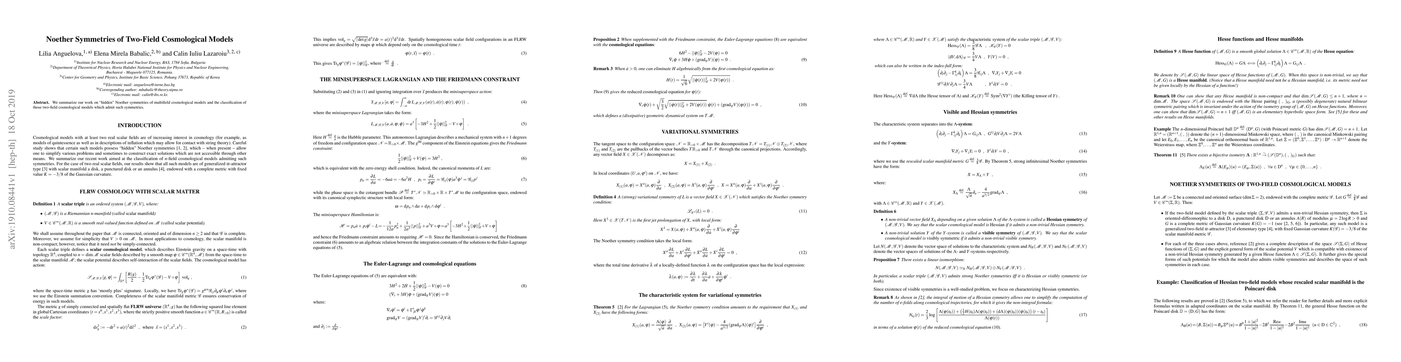 We summarize our work on "hidden" Noether symmetries of multifield cosmological models and the classification of those two-field cosmological models which admit such symmetries.