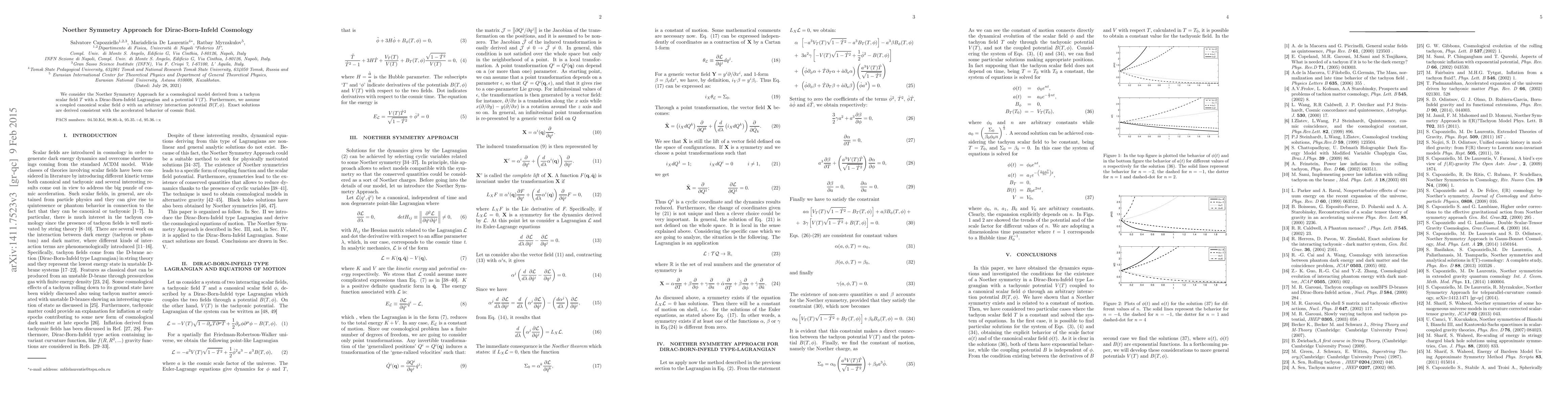 This paper applies the Noether Symmetry Approach to a cosmological model based on a tachyon scalar field and a Dirac-Born-Infeld Lagrangian, deriving exact solutions that align with the accelerated expansion of the universe, incorporating an interaction potential between the tachyon and a coupled scalar field.
