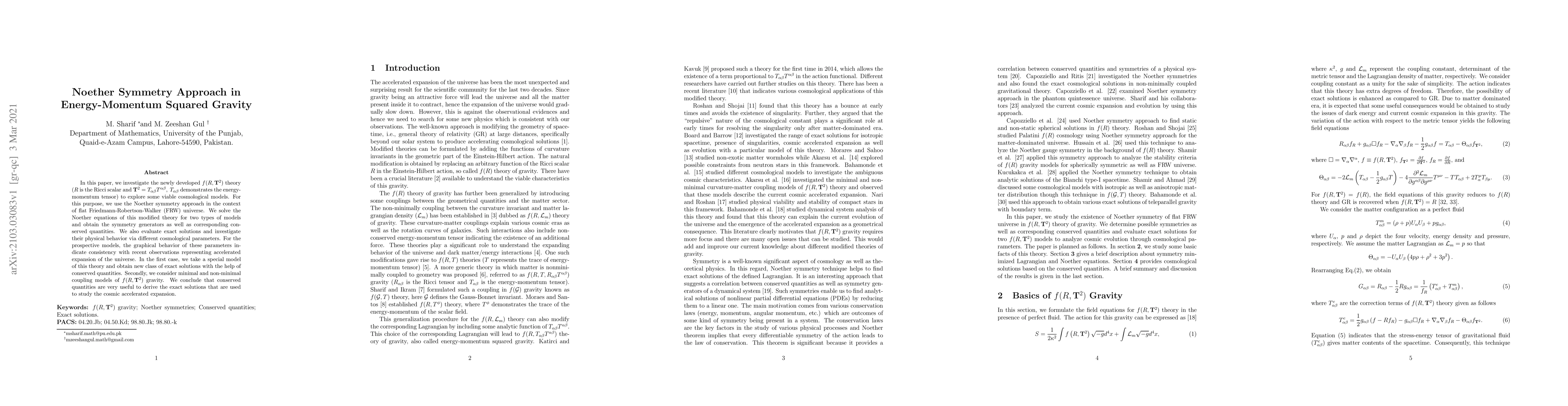 This paper explores the $f(R,\mathbf{T}^2)$ theory of gravity using the Noether symmetry approach in a flat FRW universe to derive cosmological models. It finds exact solutions and conserved quantities that are consistent with observations of accelerated cosmic expansion.
