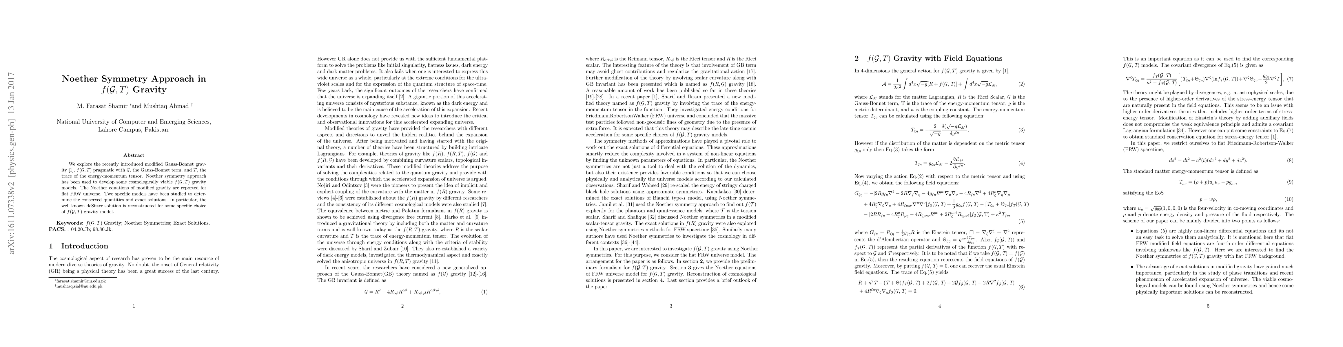 The paper presents Noether equations for modified gravity in $f(\mathcal{G},T)$ gravity and demonstrates their use in deriving conserved quantities and exact solutions, specifically for two cosmological models.
