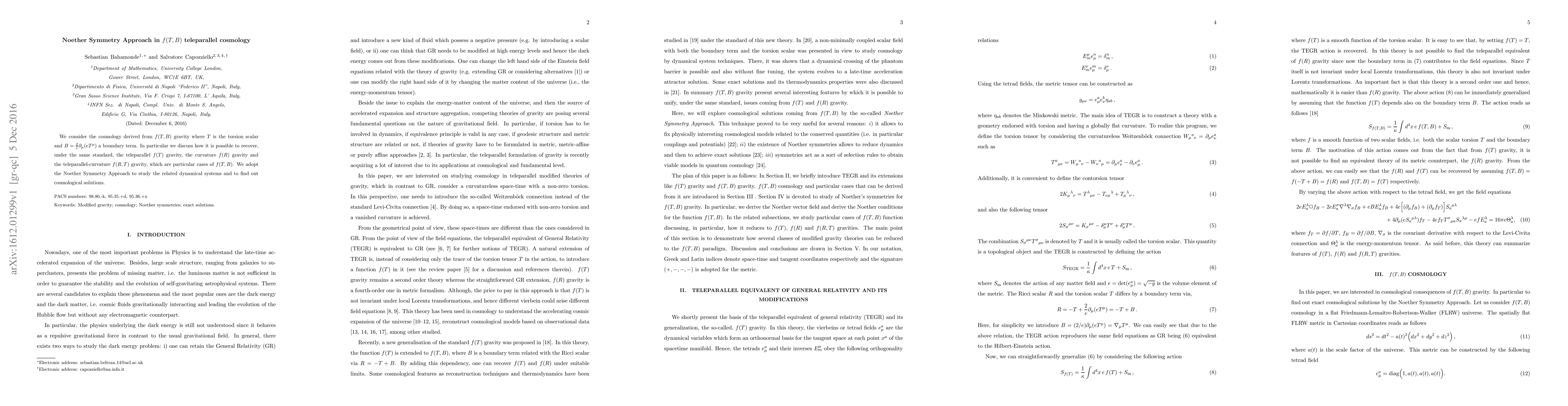 We consider the cosmology derived from $f(T,B)$ gravity where $T$ is the torsion scalar and $B=\frac{2}{e}\partial_{\mu}(e T^{\mu})$ a boundary term. In particular we discuss how it is possible to recover, under the same standard, the teleparallel $f(T)$ gravity, the curvature $f(R)$ gravity and the teleparallel-curvature $f(R,T)$ gravity, which are particular cases of $f(T,B)$. We adopt the Noether Symmetry Approach to study the related dynamical systems and to find out cosmological solutions.