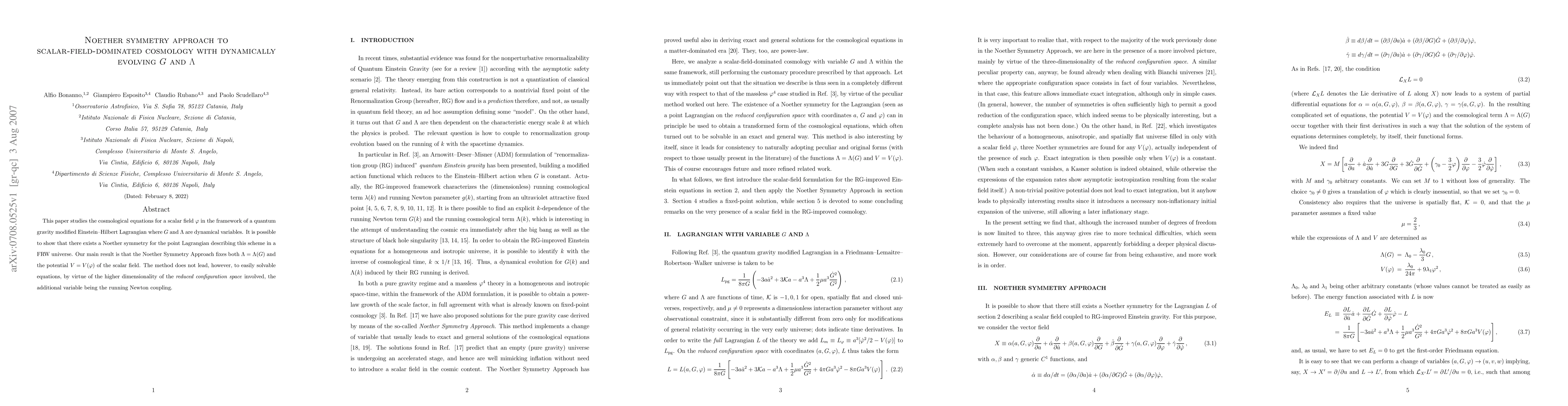 This paper studies the cosmological equations for a scalar field Phi in the framework of a quantum gravity modified Einstein--Hilbert Lagrangian where G and Lambda are dynamical variables. It is possible to show that there exists a Noether symmetry for the point Lagrangian describing this scheme in a FRW universe. Our main result is that the Noether Symmetry Approach fixes both Lambda = Lambda(G) and the potential V = V(Phi) of the scalar field. The method does not lead, however, to easily solvable equations, by virtue of the higher dimensionality of the reduced configuration space involved, the additional variable being the running Newton coupling.