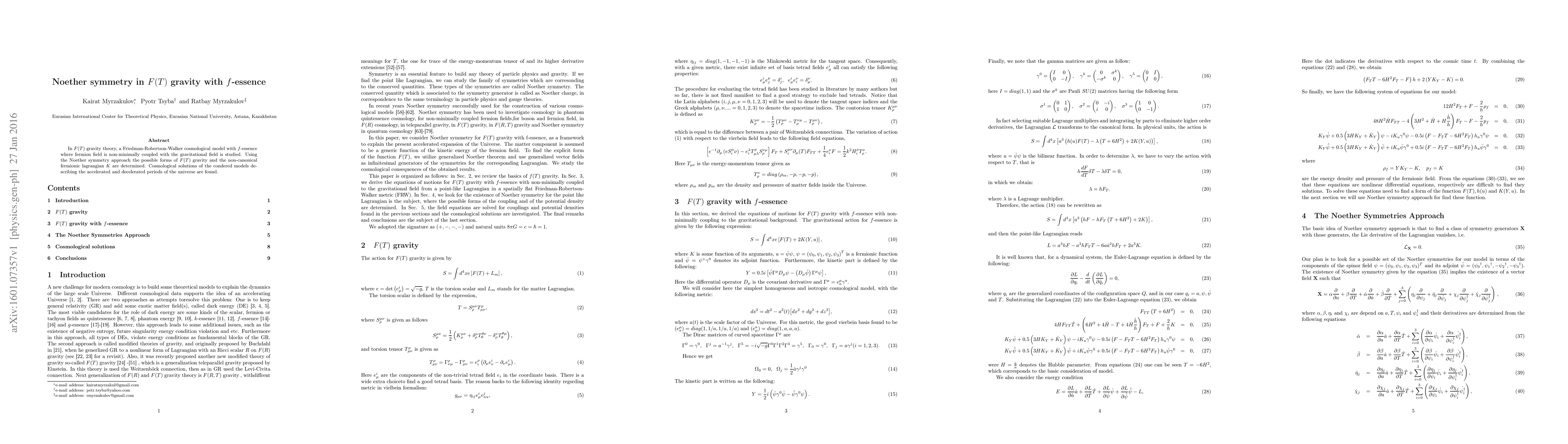 This paper explores $F(T)$ gravity with $f$-essence in a Friedman-Robertson-Walker model, determining possible forms via Noether symmetry. It finds cosmological solutions that describe both accelerated and decelerated phases of the universe.